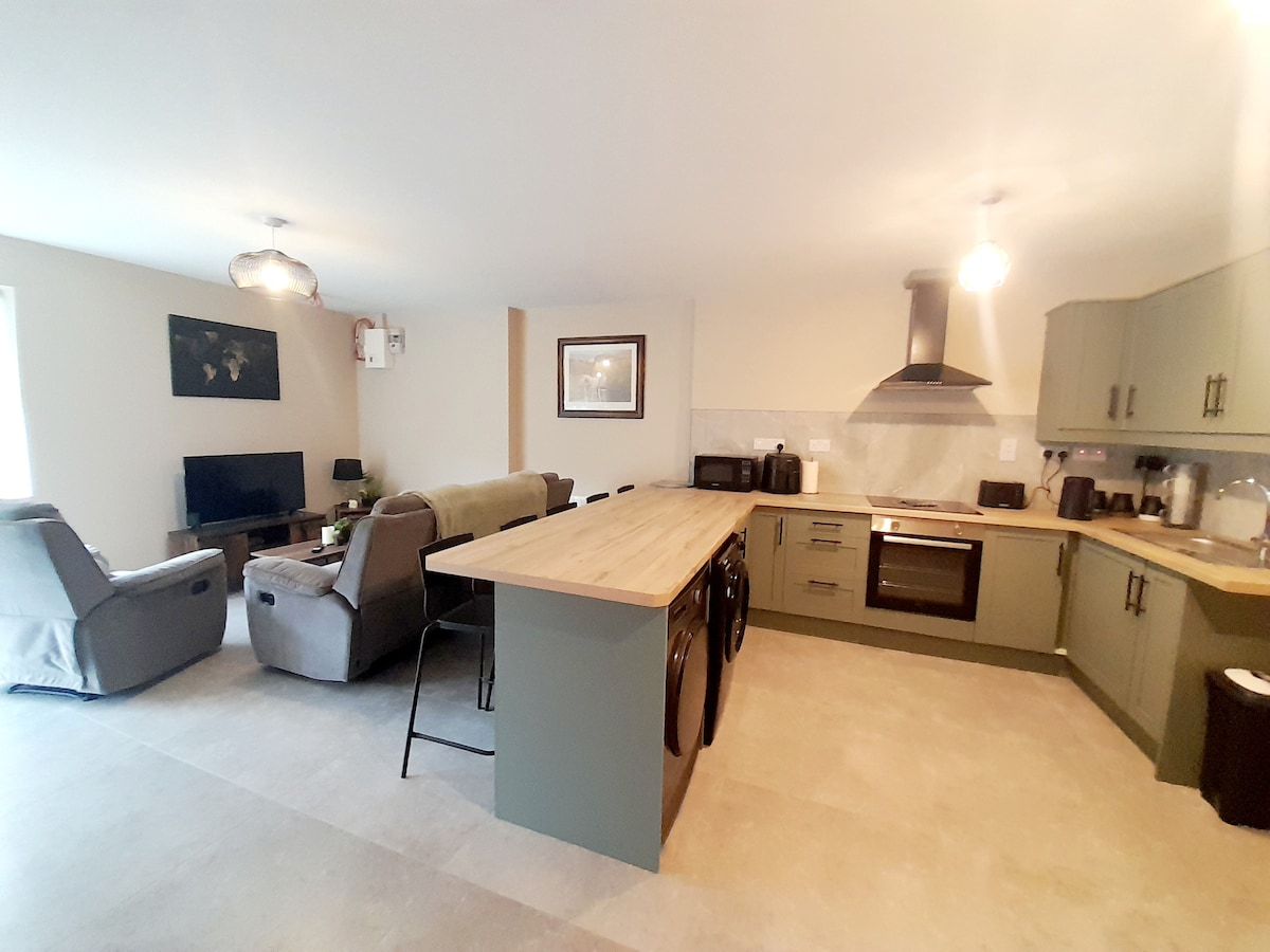 This property is located in a quiet country area yet only 8km to the M7 motorway,we are 13km from the popular designer Kildare Village shopping outlet.Within minutes walk to the scenic Moore Abbey Woods to enjoy fantastic trails & relax with a coffee at Woodstack cafe.For more walking we are 5mins drive from the Barrow Blueway,beautiful canal walks.We are located beside our local horse riding school,Fox Cover View stables. Kildare/Laois attractions Curragh Racecourse 16mins Punchestown Racecourse 30mins Mondello Park 30mins Stradbally Electric Picnic 18mins Ratheniska National Ploughing Championships 25mins This apartment comprises of a fully equipped kitchen/dining/living room area,2 bedrooms & 2 ensuite bathrooms,the downstairs bedroom has a double bed,upstairs bedroom with 1 double bed,2 single beds & a toddler bed also available.There is WiFi & a fully loaded amazon fire stick.A separate utility room with washing machine,iron&ironing board.This apartment is adjacent to family home with a fence dividing the property.