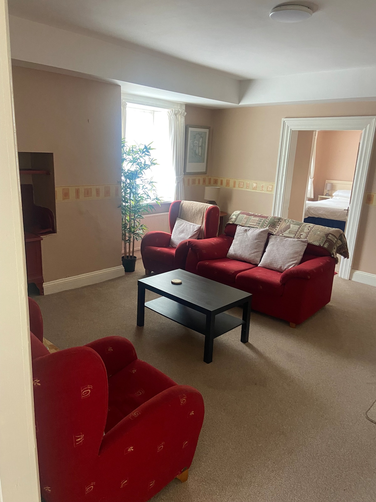 Enjoy a stylish experience at this centrally-located apartment on the Main Street, Abbeyleix. The apartment is in a gated community -free on street parking. The apartment was built on the site of a carpet factory which wove the carpets for the titanic ship. It has it's own private entry, with stairway leading to living, kitchen and bedroom. It is decorated in a contemporary style. It is designed for 2 but sofa bed in living/ kitchen can sleep 2. note 1 bathroom accessed through only bedroom.