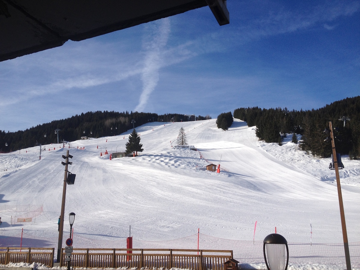Enjoy the amazing view from our terrace in our appartement , completely renovated in 2023 , located in the centre of Courchevel village , in front of the slope and ski lift ( across the street ) One big living room with one murphy bed (2 pers) and a sofa ( 2 pers), kitchen fully equipped, balcony Shops, bars, restaurant and public parking nearby . Bedlinen and towels are not provided .
