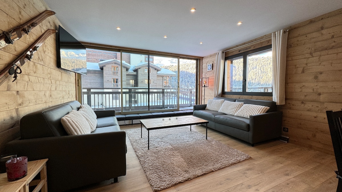 Luxury apartment in Courchevel 1650 Moriond, in Résidence 1650, ski-in/ski-out, right on the slopes and in the center of the resort. Ideal for families or friends: living room with very comfortable sofa bed, bedroom with bunk beds, storage space, private parking (height 190 cm). Close to restaurants, shops, and the snow front. Perfect holiday rental for skiing, mountain trips, luxury, and comfort in Courchevel Moriond, with immediate access to the ski lifts.