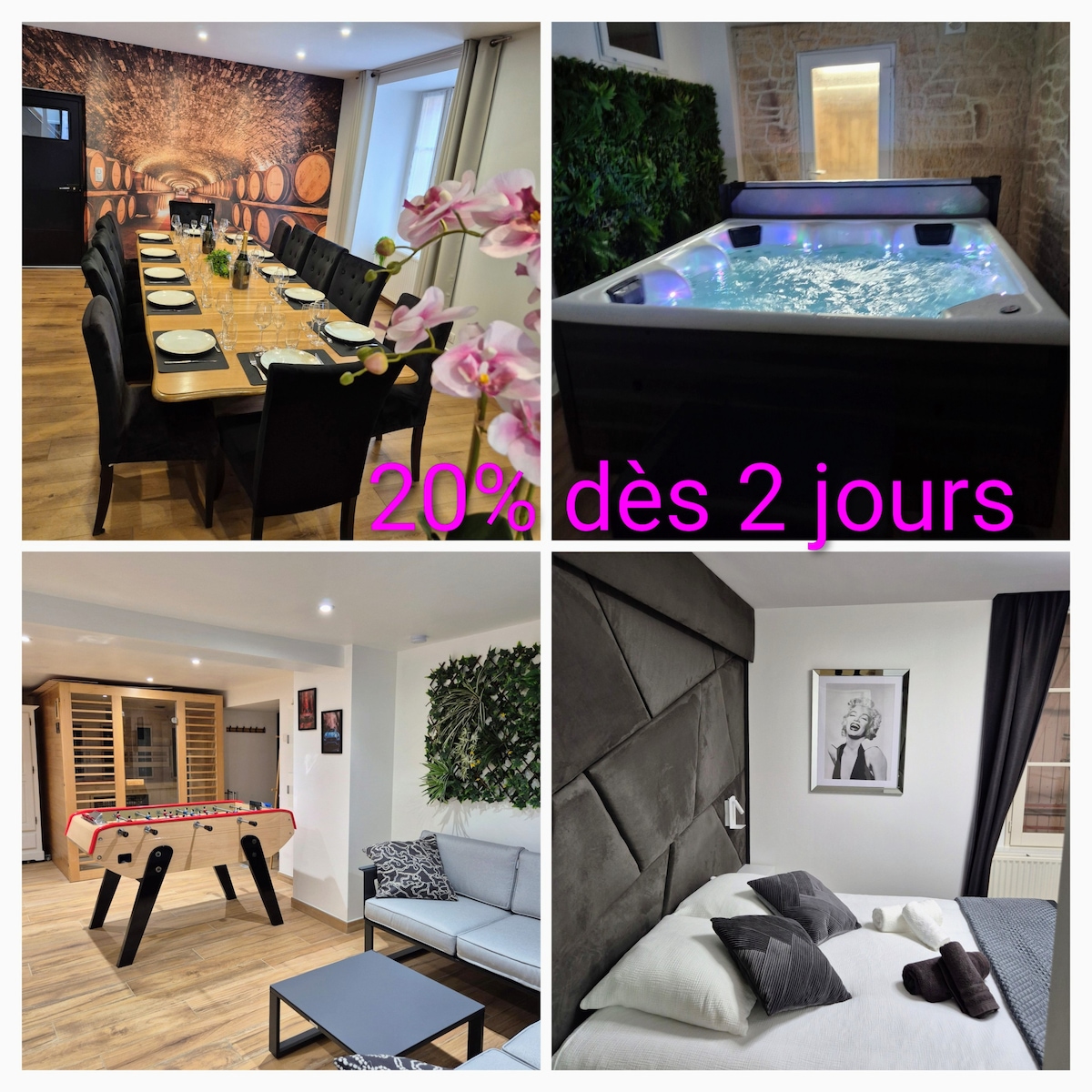 Maison tout confort entièrement rénovée, située dans un village accolé à Vitry-le-François, idéale pour familles et groupes jusqu’à 14 personnes. Profitez de la piscine intérieure chauffée à 30° toute l’année pour un séjour détente en toute saison. Espaces lumineux, chambres spacieuses et équipement complet pour des moments conviviaux. Situation calme, proche commerces, Lac du Der et Champagne à proximité immédiate.