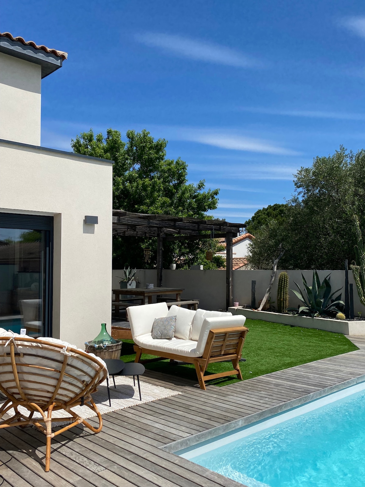 Située près du Bassin de Thau, à proximité de Mèze, Balaruc, Sète... Villa contemporaine de 105 m2 habitables 3 chambres (dont 1 dans la dépendance) : - 1 suite parentale ( salle d'eau, wc, dressing) lit 160 - 1 chambre avec placard , 2 lits simples de 90cm, 1 salle d'eau -1 chambre à l'ext de la maison dans la dépendance autour de la piscine, lit 160cm, placards, salle d'eau et WC Salon, salle à manger avec cuisine ouverte sur une grande terrasse Garage, Piscine avec transats, Terrain clos