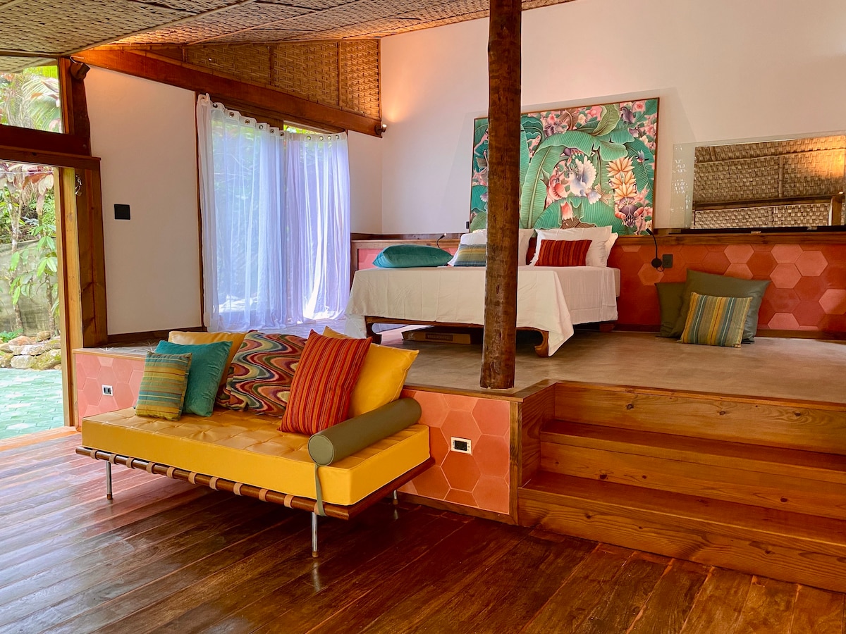 Charmosos estúdios self catering na linda praia do Prumirim. Entrada independente, pátio privado, cozinha totalmente equipada, cama queen size de alta qualidade, sala de estar confortável. Tudo projetado com qualidade, conforto e estilo. Grandes janelas panorâmicas que vão fazer você se sentir entre as copas das árvores! Este é um lugar mágico para quem procura uma fuga romântica à beira-mar conectando-se à natureza sem comprometer seu conforto. Tudo meticulosamente limpo, sanitizado e seguro!