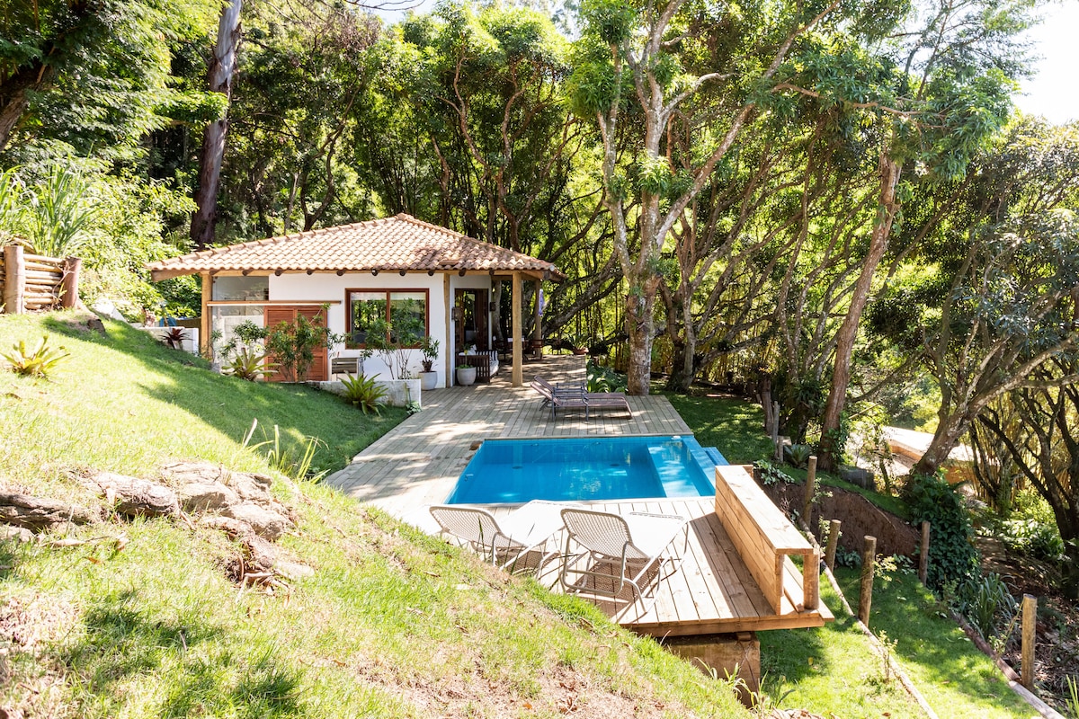 Esta casa é o refúgio tranquilo que você procura, com vista deslumbrante e cercada por pássaros. A cozinha integrada com bancada americana e a sala iluminada com móveis rústicos criam um ambiente aconchegante. Na varanda, relaxe em uma rede ou prepare um churrasco delicioso. O quarto com cama queen, TV e armário, e banheiro equipado com banheira e chuveiro separados, garantem seu conforto. Além disso, a casa tem uma horta e quintal. Não perca a chance de desfrutar desta casa única!