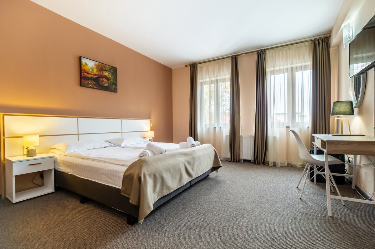 Tariffs: Standard room - 240 lei single/day - 280 lei double/day Superior room - 260 lei single/day - 300 lei double/day Deluxe room - 300 lei single/day - 340 lei double/day Triple deluxe room - 300 lei single/day - 340 lei double/day - 380 lei triple/zday Quadruple room deluxe - 300 lei single/day - 340 lei double/day - 380 lei triple/day - 420 lei cvadrupla/day Apartament - 520 lei single/double/day - 560 lei triple/day - 600 lei cvadrupla/day *Prices include breakfast
