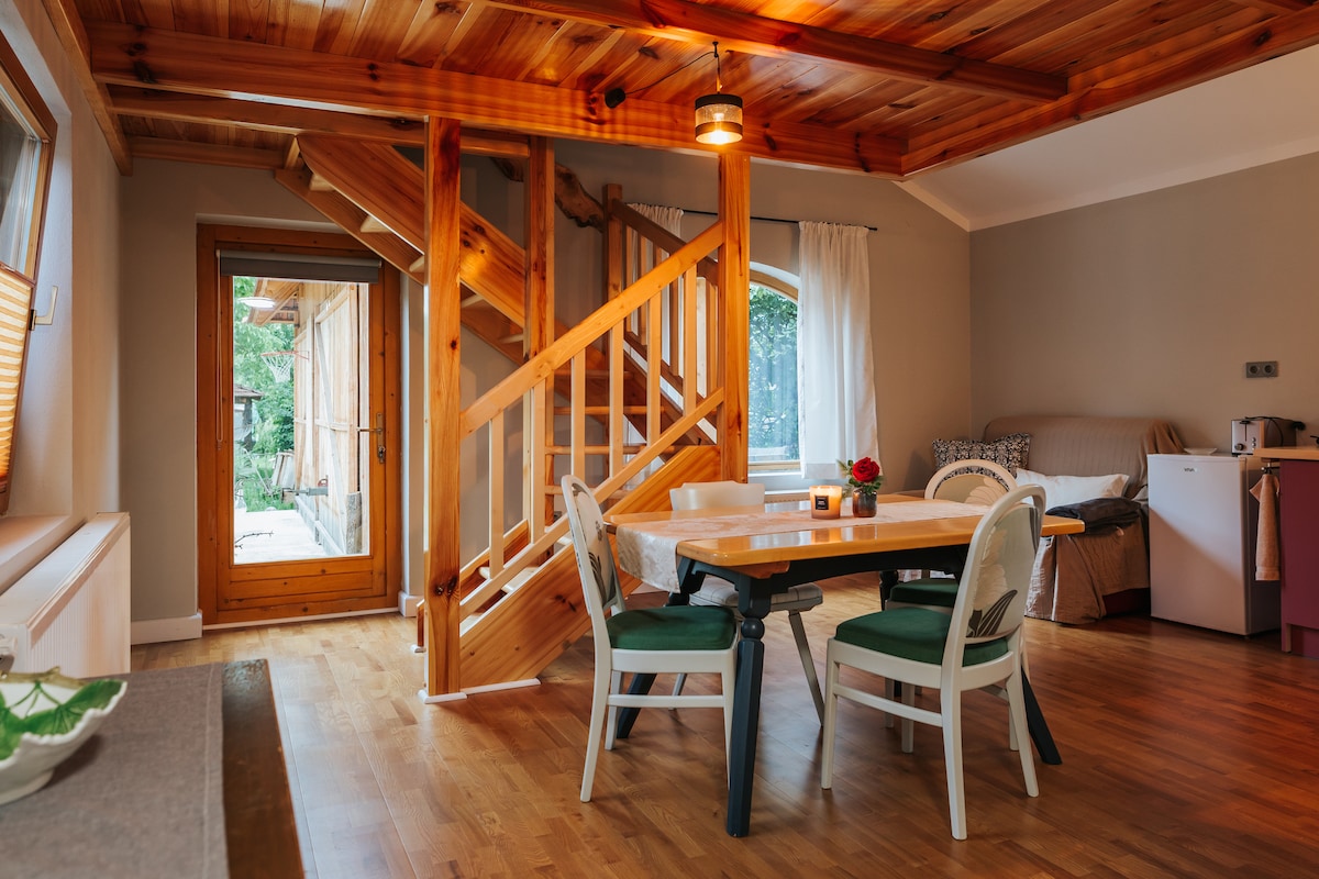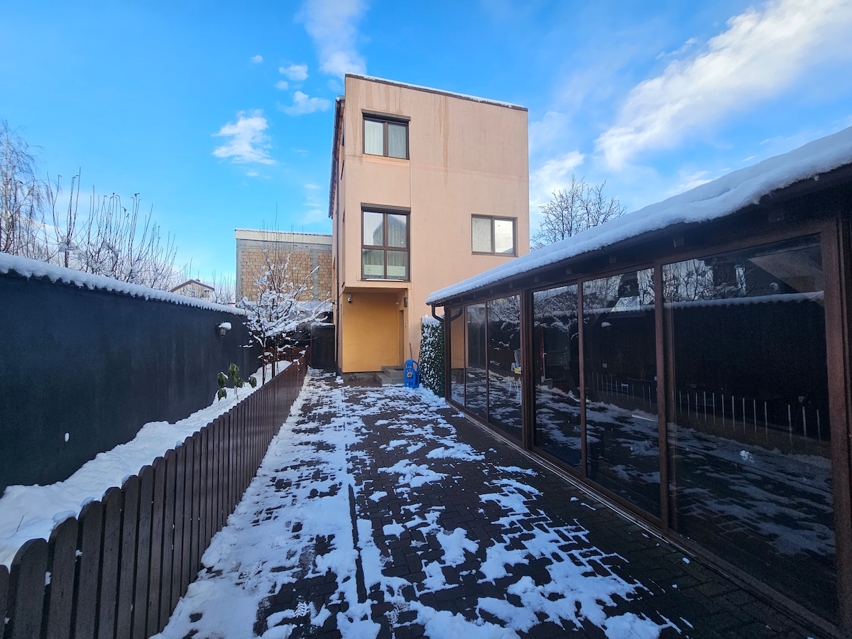 Welcome to a bright and welcoming attic, ideal for families or small groups looking for peace, comfort, and quick access to attractions in the Brașov–Râșnov area. The attic has a completely separate entrance, is located within a private courtyard, and features two bathrooms, one of which is en-suite—a major advantage for longer stays or groups. The hosts live on the ground floor of the house, in the same courtyard, and are available if needed while fully respecting guests’ privacy.
