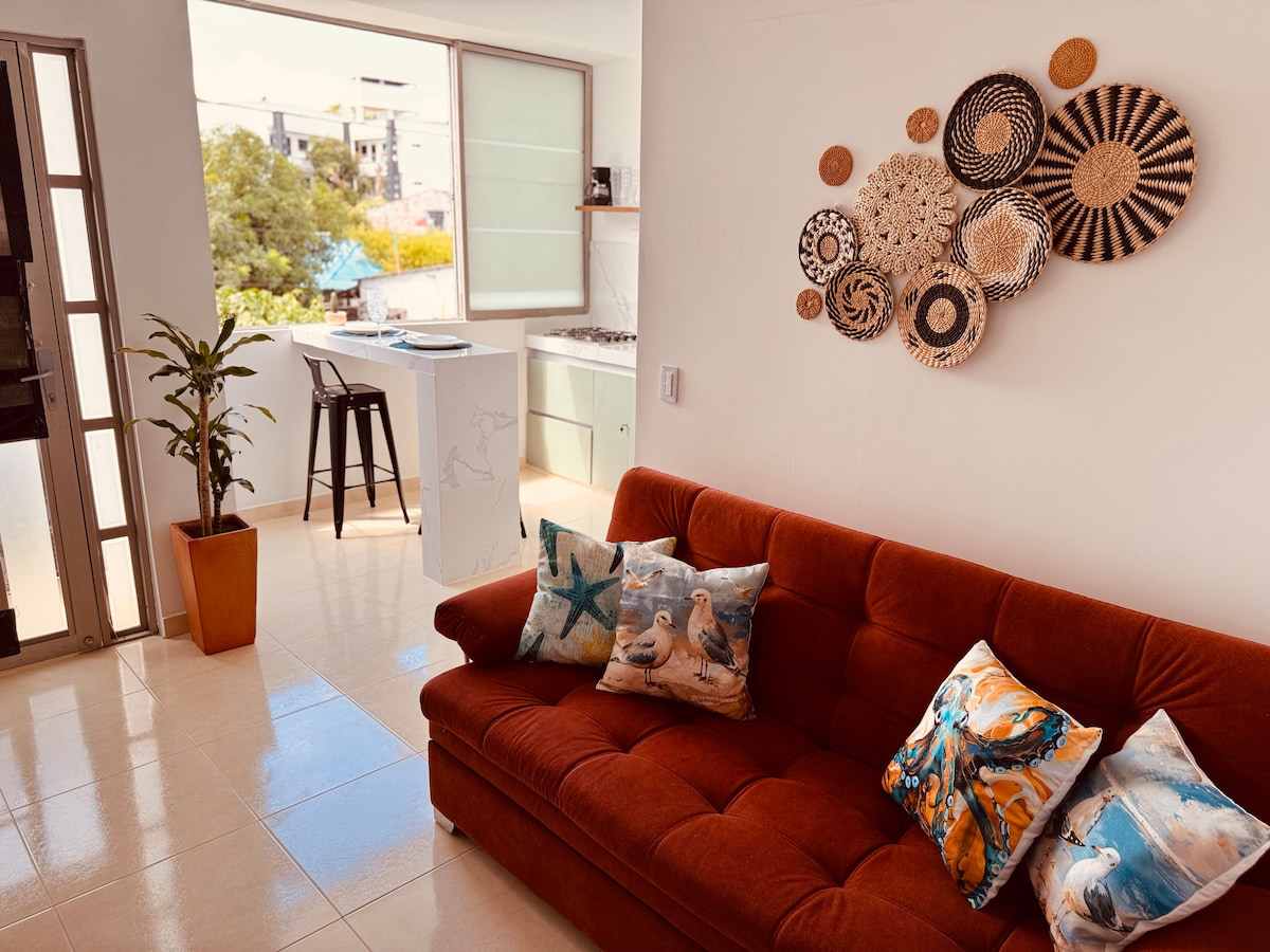 Estrena apartaestudio moderno de 39 m² con Wi-Fi de velocida200 Mbps,ideal para trabajar o relajarte. Decoración clara y espacios funcionales, a pasos de la playa y rodeado de cafés y tiendas.Perfecto para parejas o teletrabajadores que buscan lo mejor del Caribe colombiano Equipado con todo lo necesario: aire acondicionado,cocina integralConUtensilios,nevera,TVde42” lavadora. Ubicado a 600 m de la playa y a 150 m de la vía principal,lo que facilita el acceso a transporte público o carro propio.