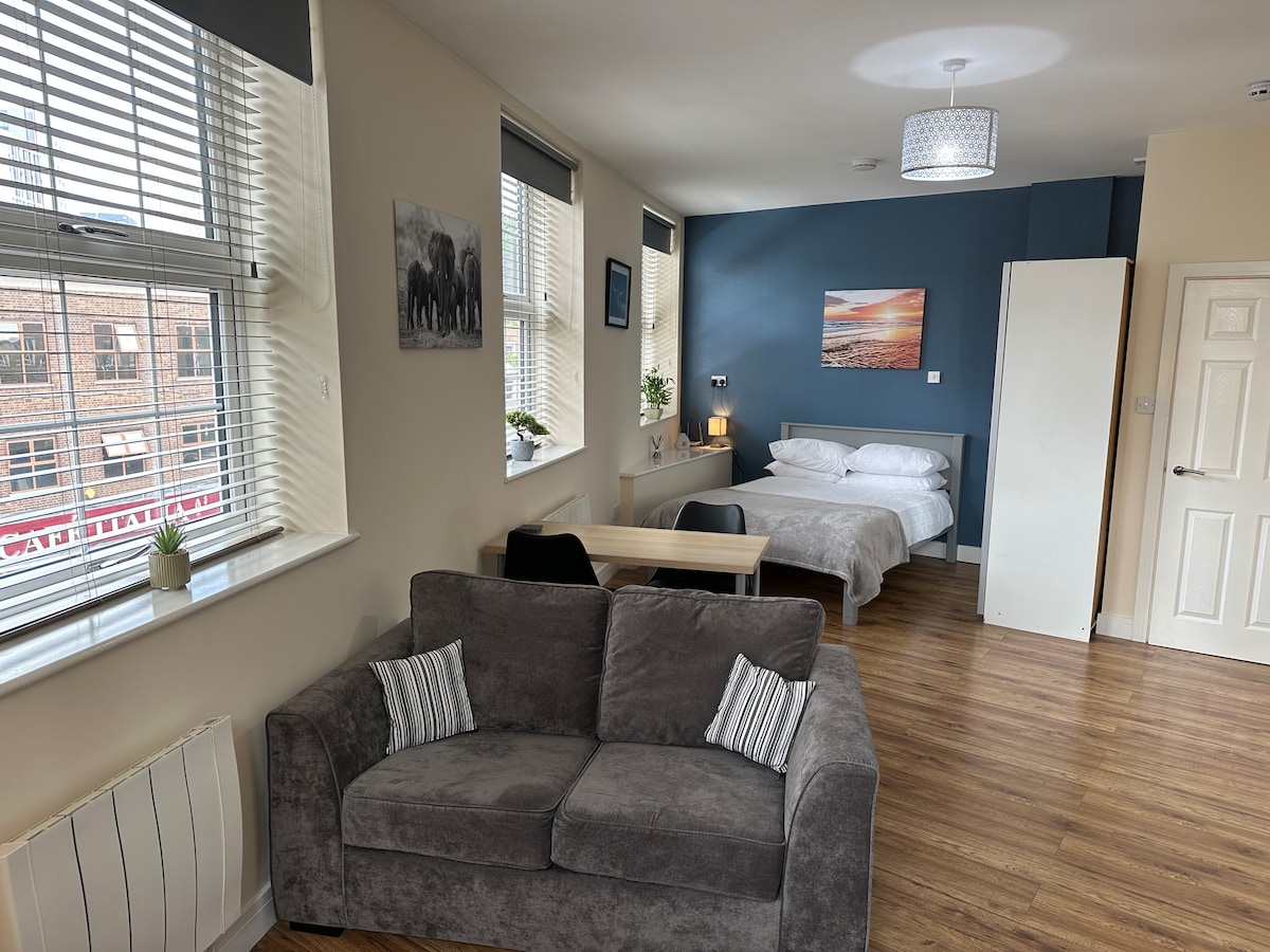 A nicely furnished self-contained studio with 4 surrounding windows that provide plenty of natural light and views of the city centre. The apartment has full kitchen and en-suite facilities, and is one of four studio rentals on offer at our Trinity st complex. Located within the heart of the city centre with easy walkable access to the University, transport links and all of Coventry's central attractions. CBS arena, Warwick uni, JLR, Birmingham, NEC are easily accessable by public transport.