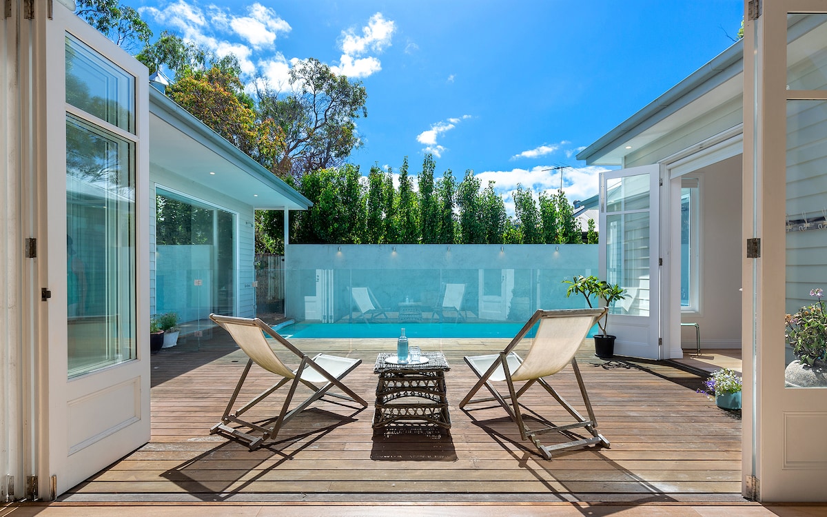 Blending modern, French & farmhouse influences, our tucked-away slice of heaven captures the best of the wine region. With remnant forest surrounds, a solar-heated pool & proximity to Merricks beach (6 mins), everything is here to help you unwind. A barbecue, pizza oven, outdoor sink & two deck seating areas will draw you outside to enjoy balmy evenings. Nearby is Merricks Store and plenty of great wineries.