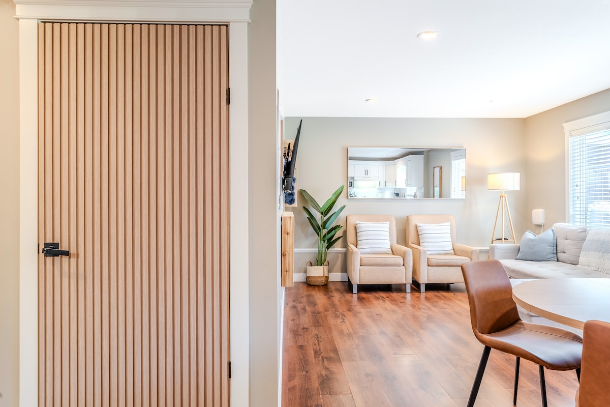 In a quiet suburban neighbourhood, a renovated, modern, clean suite with: 1 private BR w/ 1 queen bed, 1 queen sofa bed, 1 bathroom w/ tub, a full kitchen, and a laundry room. A five minute drive to downtown Duncan. There is a private entrance with a patio, and a parking spot outside your door. A heat pump, and a carbon and HEPA filter air purifier are installed for climate control. The tv has Netflix, Amazon, and Disney+. We are a small family who lives upstairs. Business Licence #00107897