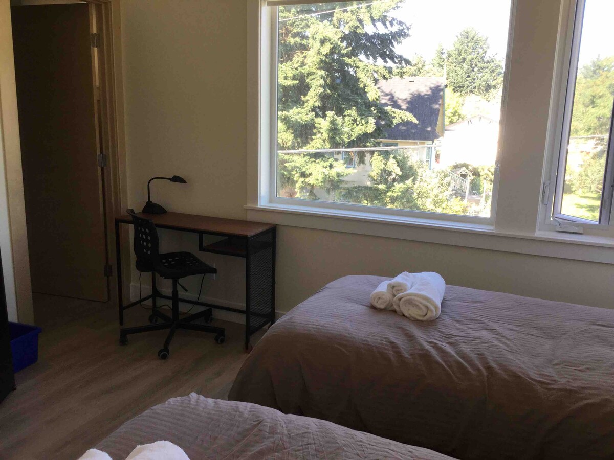 Bright bedroom on the second floor with a 4-piece ensuite and walk-in closet. Two twin XL beds can be used separately or combined into a king-size bed. Pillows and mattresses have breathable, waterproof, dust-mite-proof covers. Shared kitchen and dining area. A 20-minute walk to Royal Roads University, and a 2-minute walk to bus stops. Perfect for students, professionals, or travelers!
