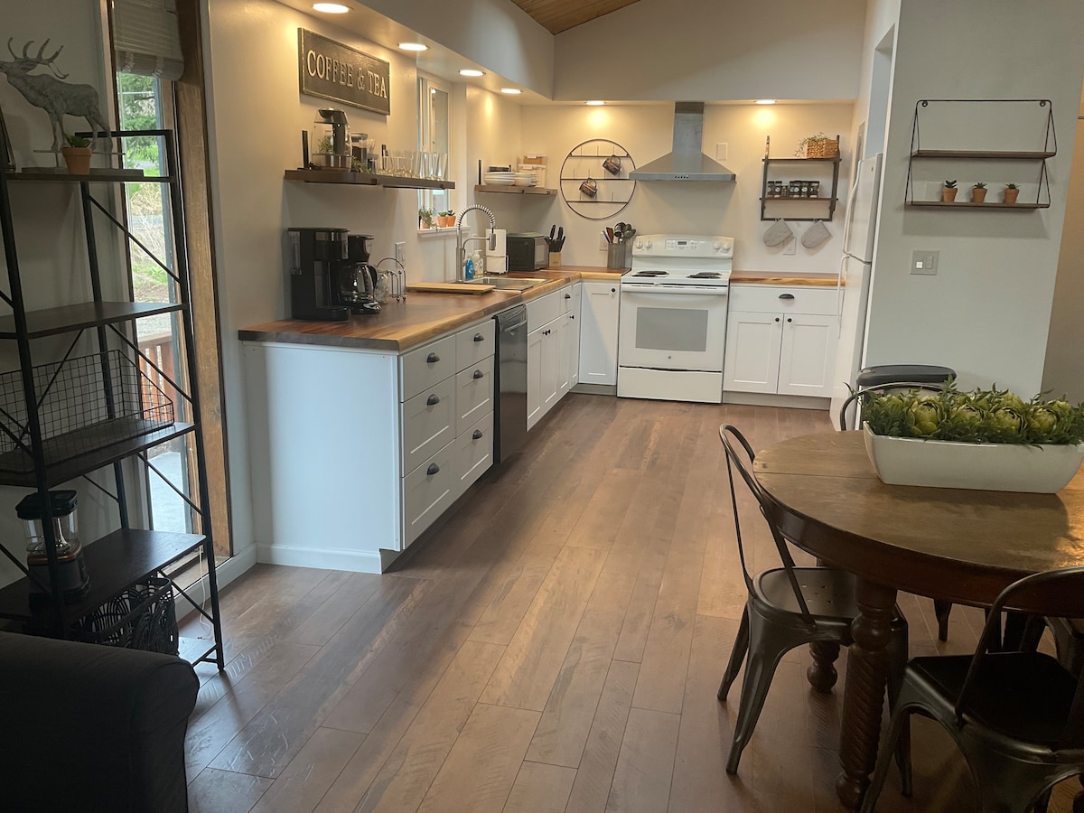 Resthaven Guest House is a very nicely furnished one bedroom home that includes all you need to make your stay comfortable and memorable. It includes a well equipped kitchen and bathroom & shower, and living and dining space for four. The bedroom includes a king bed and the living room has a comfortable queen hide a bed. Enjoy the beautiful view and peaceful sounds of the river from your deck. And finally, relax and watch YouTube Live TV or Amazon Prime Video on your living room or bedroom TV.