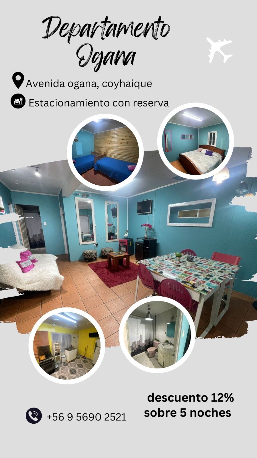 Cómodo departamento privado, para una o dos personas, ubicado en sector central, muy tranquilo y seguro en la ciudad de Coyhaique. Los/as hospedados/as, cuentan con aparcadero para vehículo. Se ubica adyacente a vivienda de propietarios, por lo cual se puede acceder a requerimientos y atención directa de estos. No se entrega servicio de desayuno.