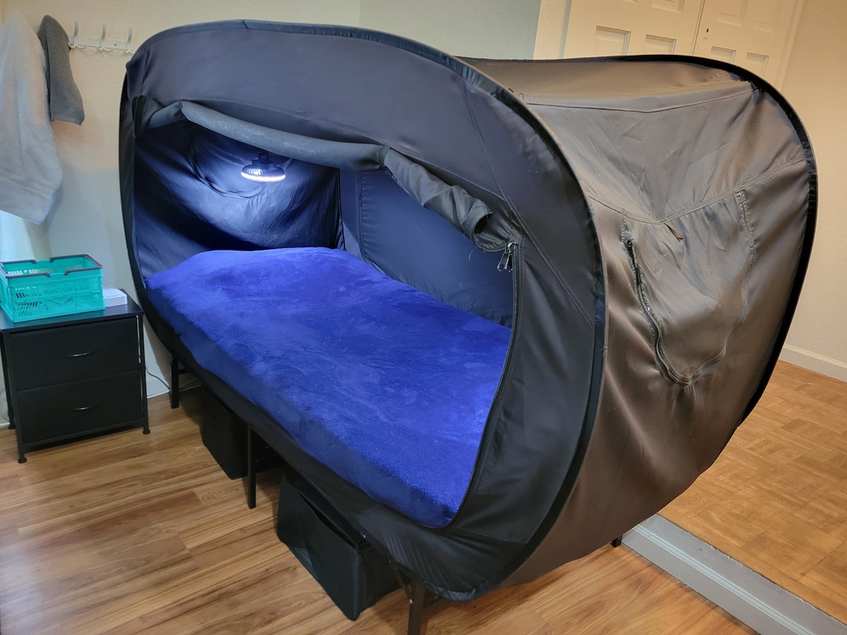 Our family’s custom container (tiny) home blends minimalist style and natural warmth with all the comforts of home. Inside, you’ll find curated design, tons of sunlight, and a peaceful energy that invites you to slow down and relax. You’ll enjoy a: Raised full sized bed with plush bedding for ultra-comfy nights Intimate lounge with seating and a Smart TV Fully stocked kitchenette Fast WiFi for work or winding down An outdoor fire pit + dining table Private, fenced-in outdoor area with parking