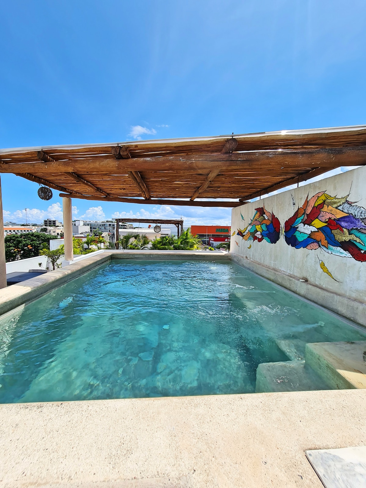 2 min walk to sea, in the famous 5th Avenue with 34 street in a safe area, this fantastic apartment is perfect for who likes good style of life. Private terrace with jacuzzi looking to a tropical garden, free WIFI Internet and private car parking. Aluxeshome has a big leaving room with a sofa coach bed, a bedroom, 2 bathrooms and a kitchen. Elevator and security guard. Close to the best Beach Clubs, Restaurants, Cafes, shops, Arts and music locals. Easy to reach by ADO bus, taxi or car.
