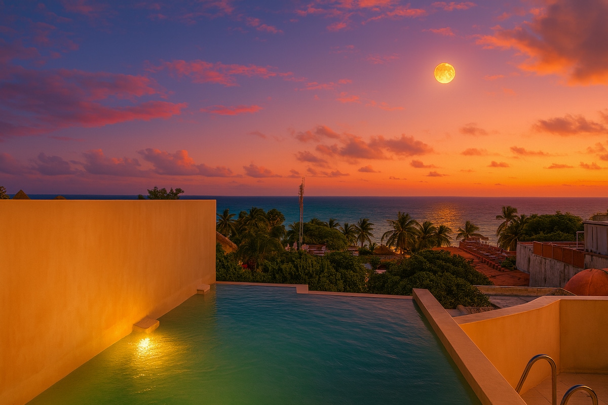 This luxury 2 bedroom, 2.5 bathroom apartment is right in the heart of Playa del Carmen and has a King size bed and 3 single beds. It has as a beautiful terrace with its Jacuzzi so you can watch the sunrise over the Caribbean waters. A symphony of colors! Or spend some time relaxing in the pool / tub on our spectacular rooftop.