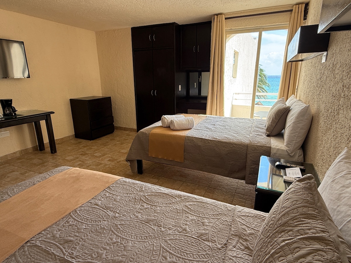 Inside the Riviera Maya Suites Condo-Hotel, relax in a spacious and comfortable room for two with a separate entrance. It features 2 Double beds, a private bathroom with amenities, daily housekeeping, Wi-Fi, a shared pool with a Jacuzzi, a safe, a minibar, cable TV, free parking, and 24-hour security and surveillance cameras. Enjoy the hammocks and lounge chairs on the communal rooftop with beautiful ocean views. Bilingual reception.