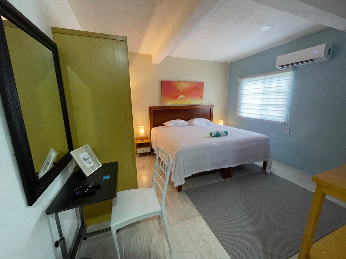Perfect for beach and nature lovers looking looking for a quiet getaway! One of the best private locations on the island, with direct access to a sandy beach where you can enjoy water sports or simply relax on the shore. Just a 5 minute drive to Cozumel’s downtown area. This newly remodeled suite has everything you need for a comfortable stay including: an open outdoor patio, a large studio, private bathroom, air conditioning, smart TV, Wi-Fi and a kitchenette stocked with new appliances.
