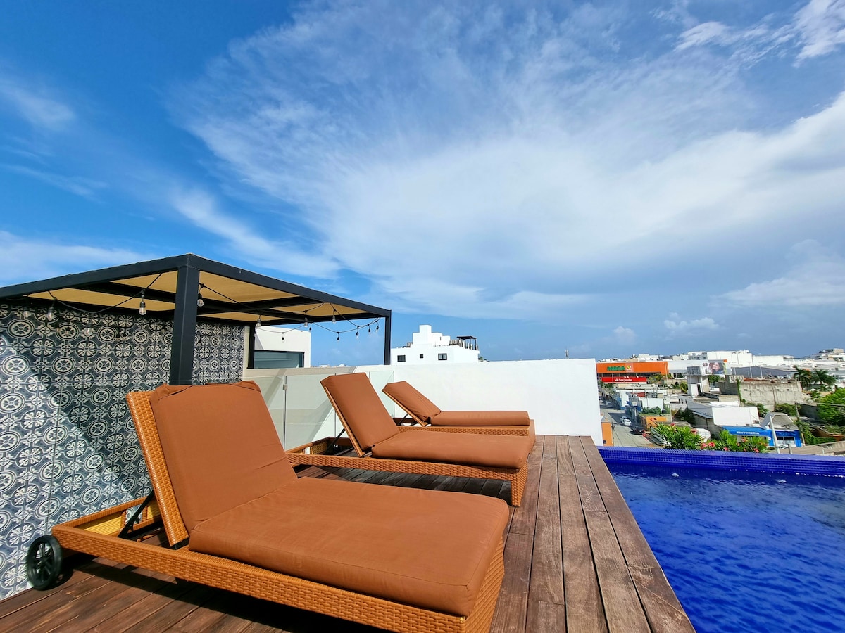 Modern, adults-only apartment in a quiet neighborhood just minutes from downtown. Guests love the peaceful setting and return often for the rooftop plunge pool, BBQ area, and daily housekeeping. Cruise the coast on free bikes or explore nearby shops and cafes. ✔ Rooftop Pool ✔ Starlink WiFi ✔ Free Bikes ✔ Full Kitchen ✔ Night Security ➕ 7-Eleven only one block away Bonus: 10% off scuba diving with top-rated Scuba Life Cozumel. Ages 12+ only.