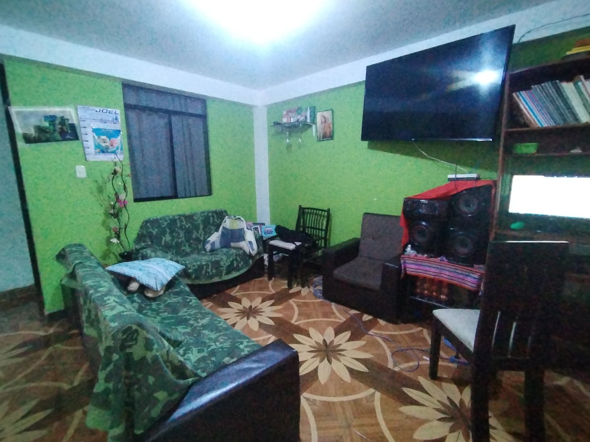 Disfruta de una estancia cómoda y acogedora; un amplio departamento ubicado en la ciudad de Abancay. Nuestro alojamiento cuenta con 4 habitaciones para tú tranquilidad y privacidad. La cocina está completamente equipada para preparar tus comidas favoritas, cocina y refrigerador. La sala es un espacio cómodo para relajarte y un pequeño patio adicional ideal para descansar al aire libre o para que tus mascotas puedan jugar, somos petfriendly y recibimos con gusto a tus amigos de cuatro patas.
