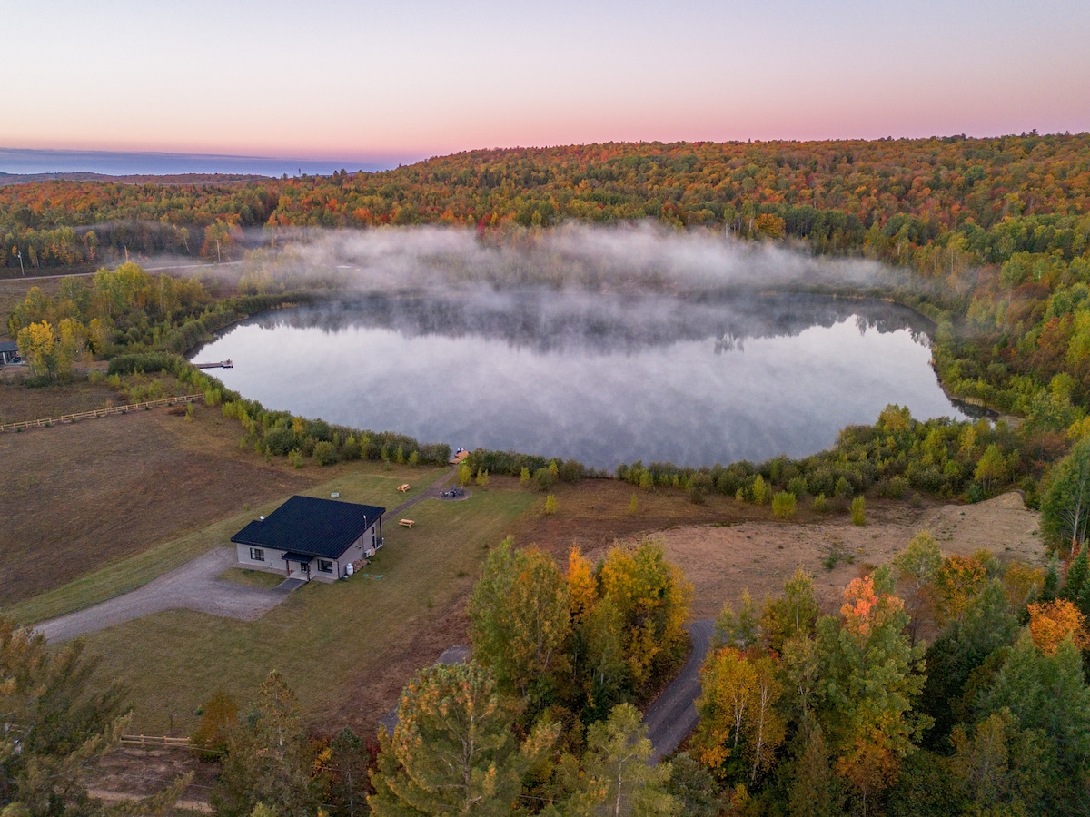 Our Nordic forest chalet is perfect for spending quality time as a couple (or with a kid), or for a work-retreat (with high-speed WiFi). The wooden interior is warm and cozy. The full-height windows offer stunning views over a forested valley. The open-concept kitchen and living room keep you in the conversation while cooking. If you prefer to cook outside, there is a fire pit with a grill and outdoor dining table. Only 70-min drive from Montreal. The lake is a 25-min walk if you park nearby.