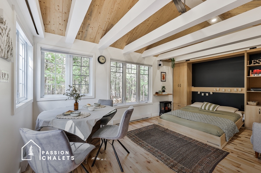 The Serenity is a new construction located within the Lac Gérard estate. This chalet can accommodate up to 9 people. Only 1 hour from Montreal, it’s perfect for a family getaway. This modern-style chalet offers splendid natural light, relaxing decor, an open-concept main area, a spa, and a dry sauna. High-speed internet ensures a stable connection for remote work, making it an ideal environment for a “workation.” CITQ: 311831