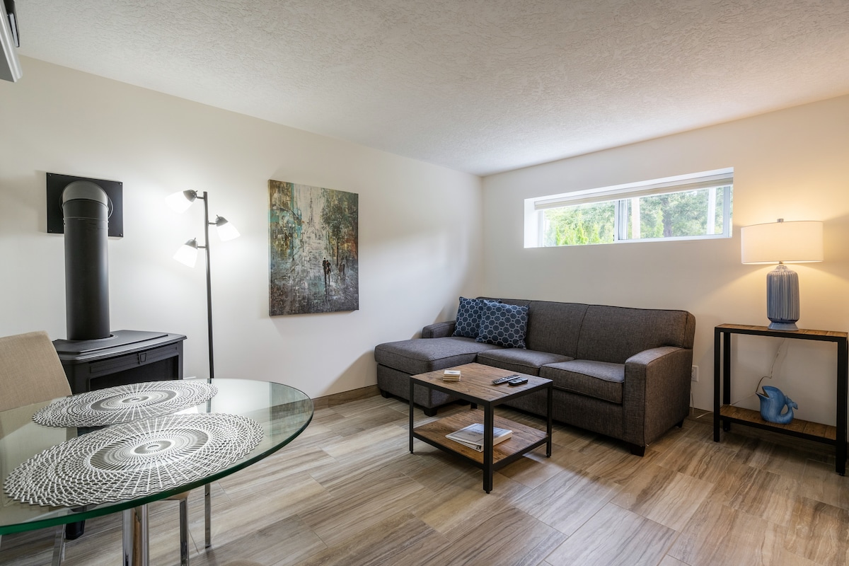 Kick back and relax in this calm, stylish space. Private entrance, basement suite, plenty of natural light, 9 ft ceilings, heated floor, spa amenities and more. Ideally located near shops, the beach, restaurants and other services, and ten minutes from downtown Victoria. If you need anything just ask; we are happy to provide information re the best spots to eat, or where to buy the best local products. With advance notice, groceries or cheese/charcuterie boards can be waiting for you.