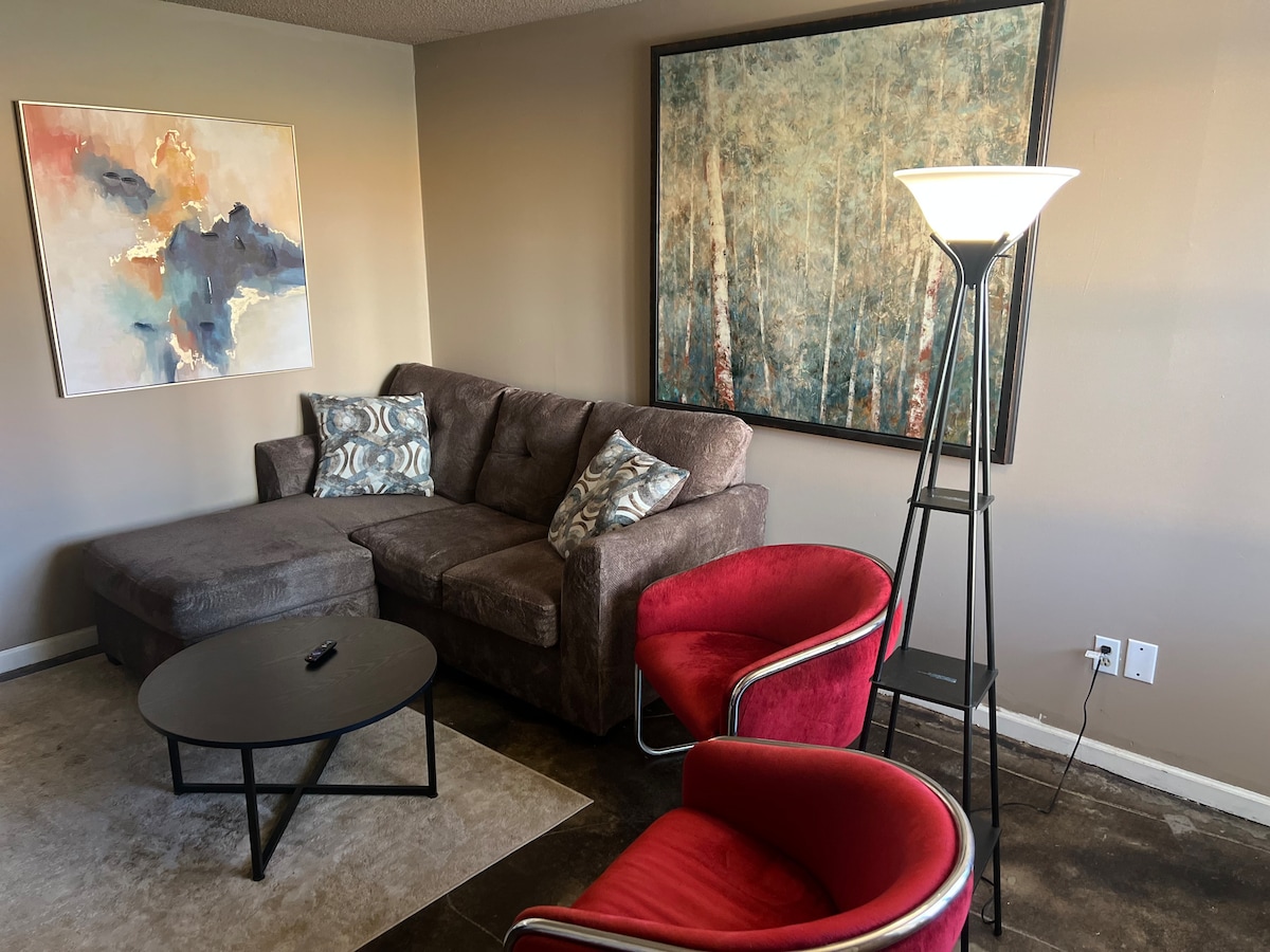 Cool, retro upper level condo in Downtown Jonesboro! Walkable to all the restaurants & live music but just far enough away (one block) for a peaceful nights rest! Free WiFi, free cable, a dedicated workspace, in-unit washer & dryer, fully equipped kitchen, jetted tub, king size comfy bed!! Everything you need to work or play❤️