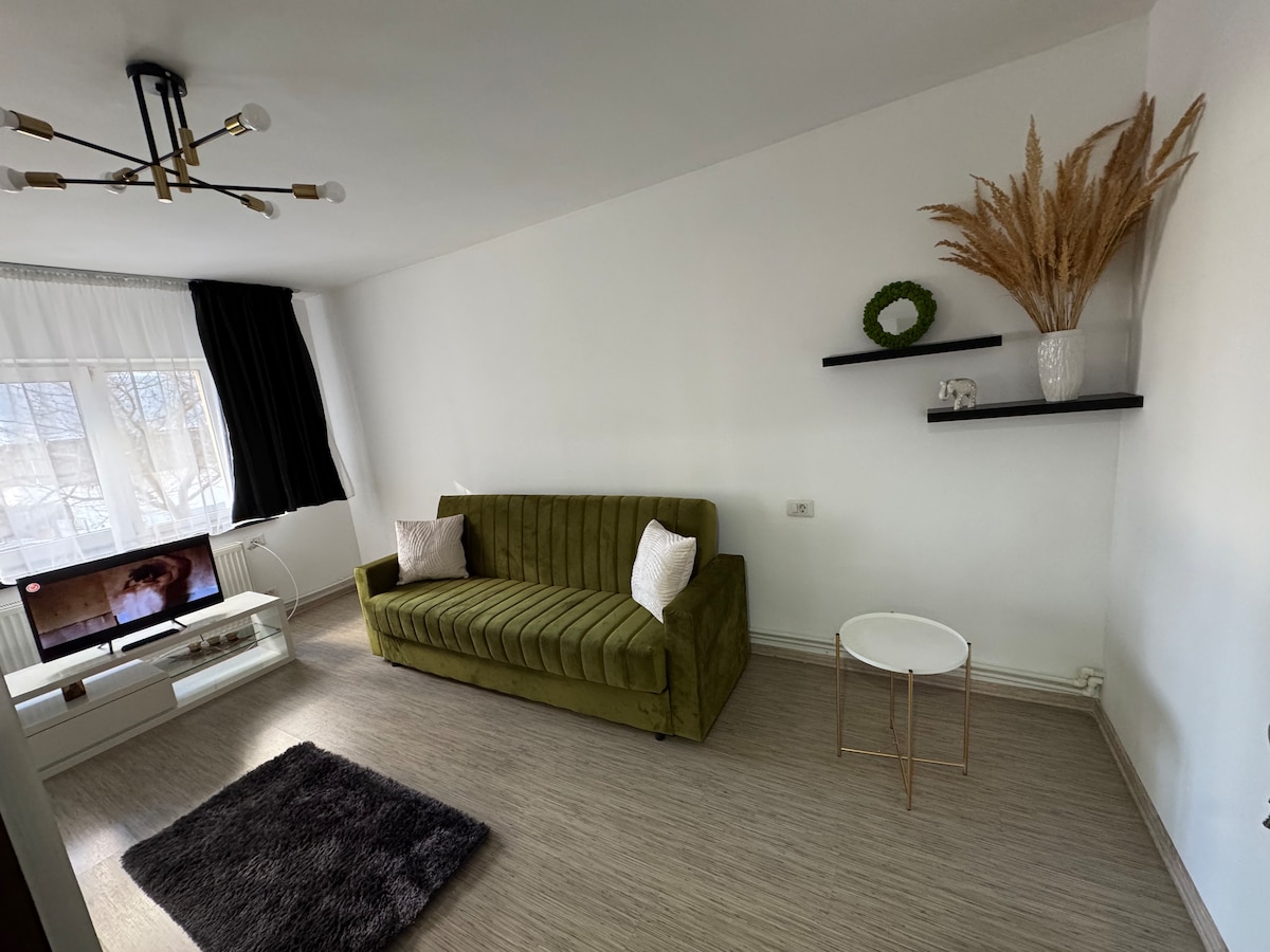 Cozy Studio in Central Craiova with City View Welcome to my comfortable studio in the heart of Craiova, just 5 minutes from the Christmas Market. Perfect for up to 2 guests, it features a large sofa bed, fully equipped kitchen, modern bathroom, fast Wi-Fi, and smart TV. Enjoy the lovely city view from the balcony. Shops, cafes, and public transport are nearby for easy exploration. Ideal for a short stay or business trip. Looking forward to hosting you!