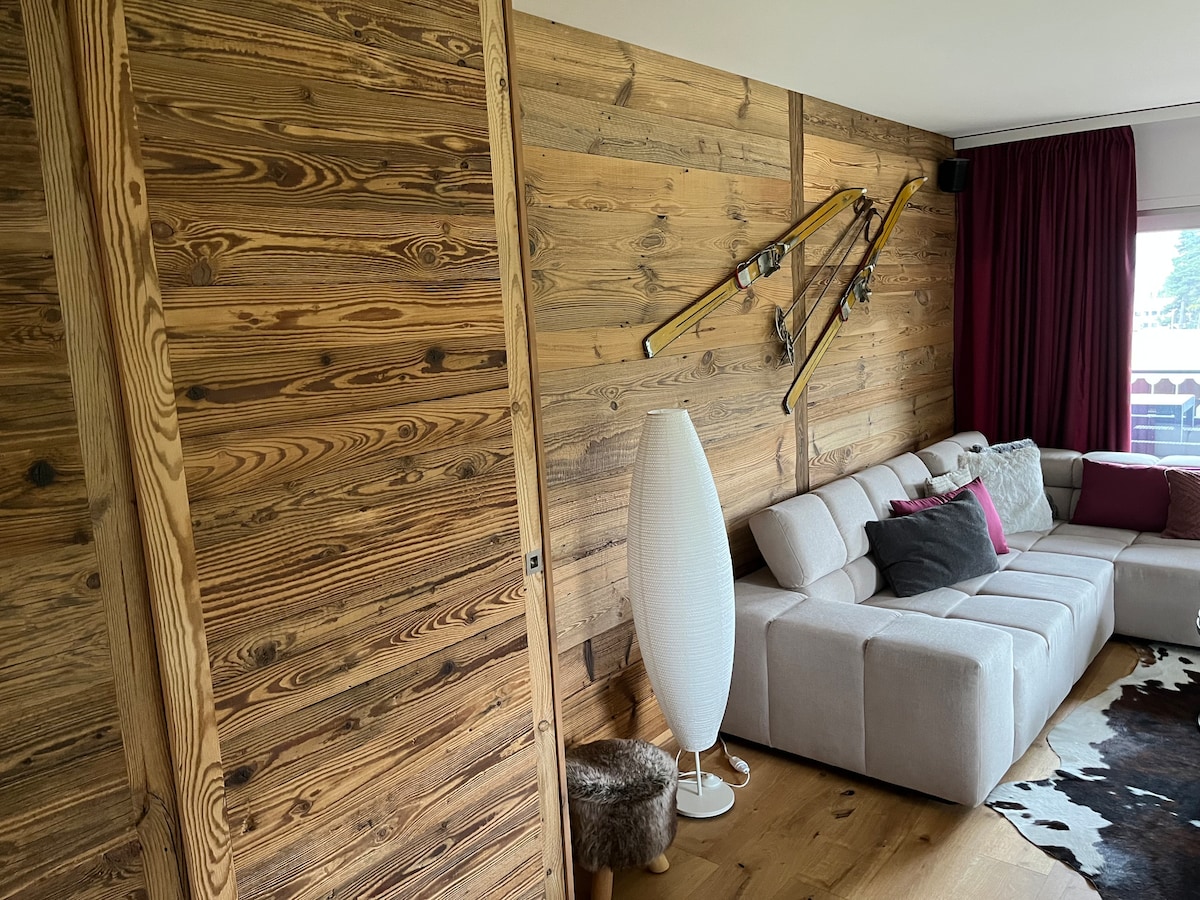 Beautiful renovated flat in the center of Crans! Walking distance to the ski slopes (Cry d’Er) and just next to the golf, ideal situation during both summer and winter! Nicely decorated with wooden walls, wooden floors and quality furnitures/equipments. Fireplace. Parking, ski room.