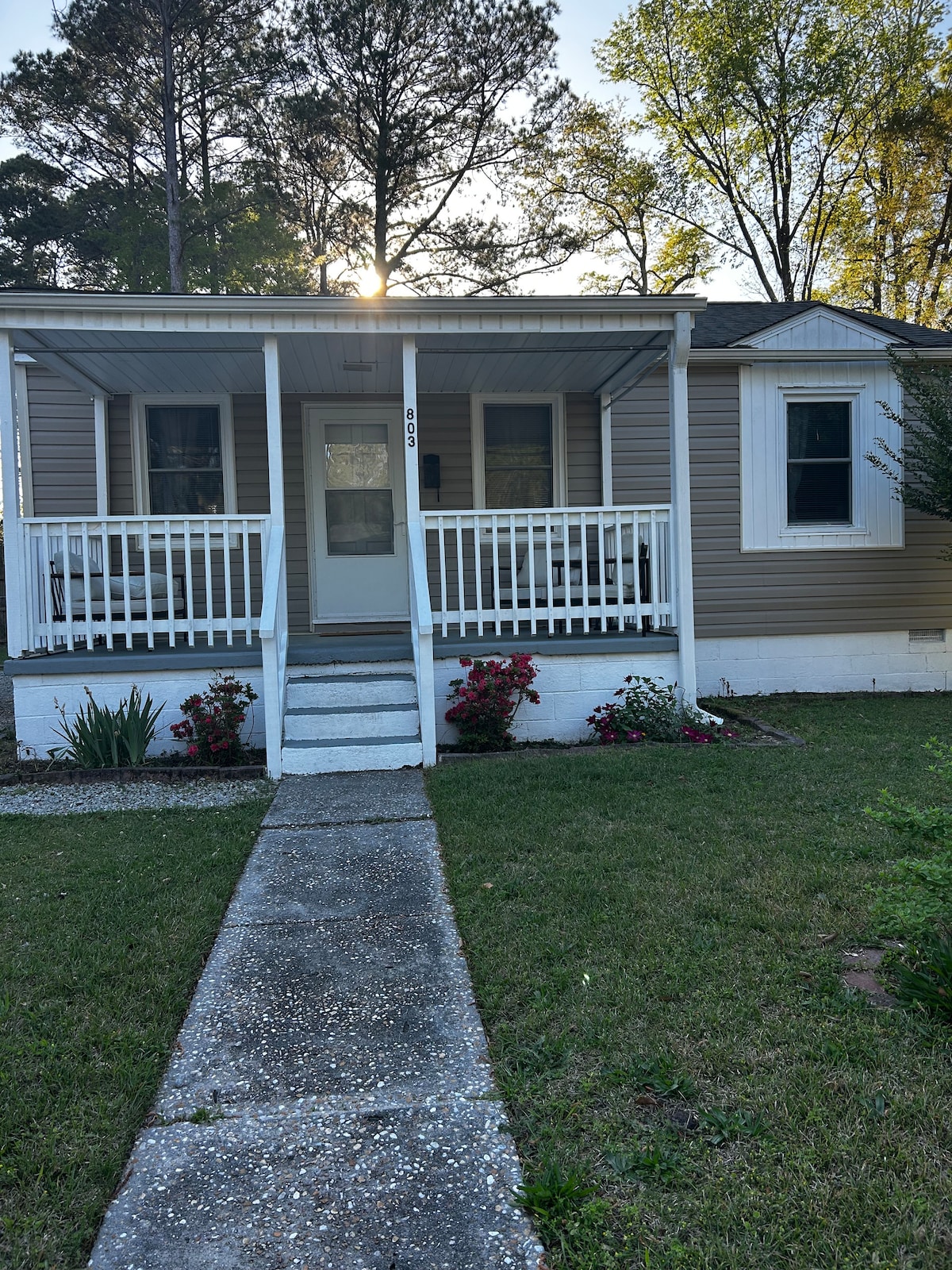 Newly built home in a tranquil setting, nestled among treetops, with a large covered porch where you can view the sunrise over the river or just relax in the rocking chairs. Filled with natural light and comfortably decorated. Oversize bedroom and bathroom with walk-in shower. Sleep up to 4 with very comfy inflatable mattress (available upon request, additional fee applies).Large fully equipped kitchen. Less than 2 miles from downtown. Book this beautiful home for an enjoyable stay in New Bern.