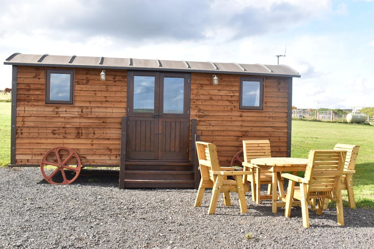 A traditionally built Shepherds Hut that sleeps two people. Life inside the shepherds hut is compact, but you have a beautiful en-suite, with shower. A fixed double bed. A small kitchen area, with fridge, microwave, kettle and toaster. There is also a tv and wood burning stove to keep you toasty and warm. Private garden, with chiminea, covered gas BBQ area. There are two pubs in the village that serve good food and both are in walking distance. Pets fee is £5 pn per pet. Parking for 1 car.