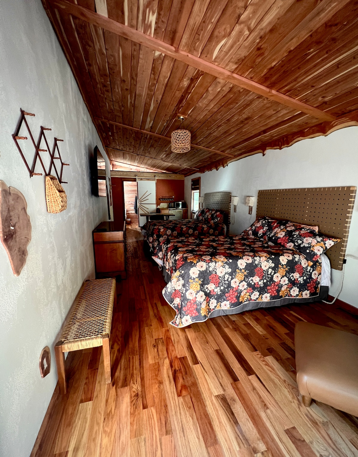 The Cuddly Cow features a full kitchen with laundry, eating bar and dining area. There is one large bedroom with a king size bed. The room has a slider out to the front with table and chairs to have a peaceful enjoyment of nature. Full size bathroom with shower over tub and dual sinks. There is a pool next to this cabin that is not useable for guests due to insurance limitations. We have 3 addt'l cabins on the property, Velvet Rooster, Happy Hound & Pampered Peacock.