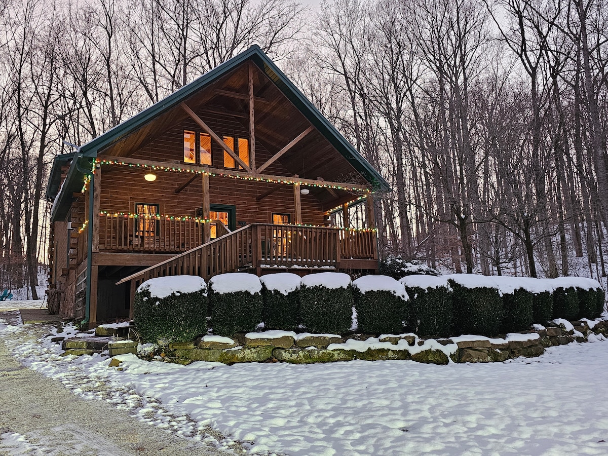Your cabin in the woods minutes from Patoka Lake, Restaurants, Located 12 Miles from the historic French Lick Resort and Casino, 15 miles from Paoli Peaks and Several Local Wineries in the surrounding area. A true log cabin with screened porch. Washer and dryer and grill, carport, fire pit with Adirondack chairs Fully furnished kitchen, a queen bed downstairs 2 double beds and sleeper sofa in the loft. Hot tub. Patoka Lake Park Pass included with stay. Highspeed internet.