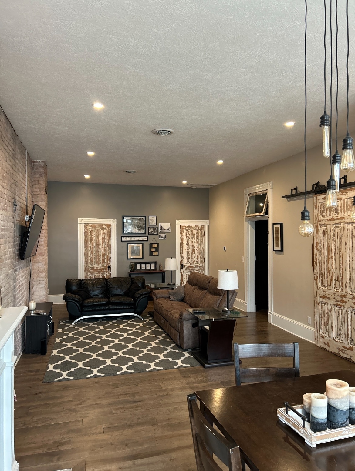 The Industrial Loft is located in downtown Bucyrus, just north of the square. A highlight of this location is the unique front-row view of local festivals and parades. Guests can also enjoy the benefits of being within the Downtown Outdoor Refreshment Area (DORA). A variety of restaurants, bars, and shops are within walking distance. The Crawford County Art Center is located on the first floor beneath the loft—see additional photos for more details about the Art Center and DORA.