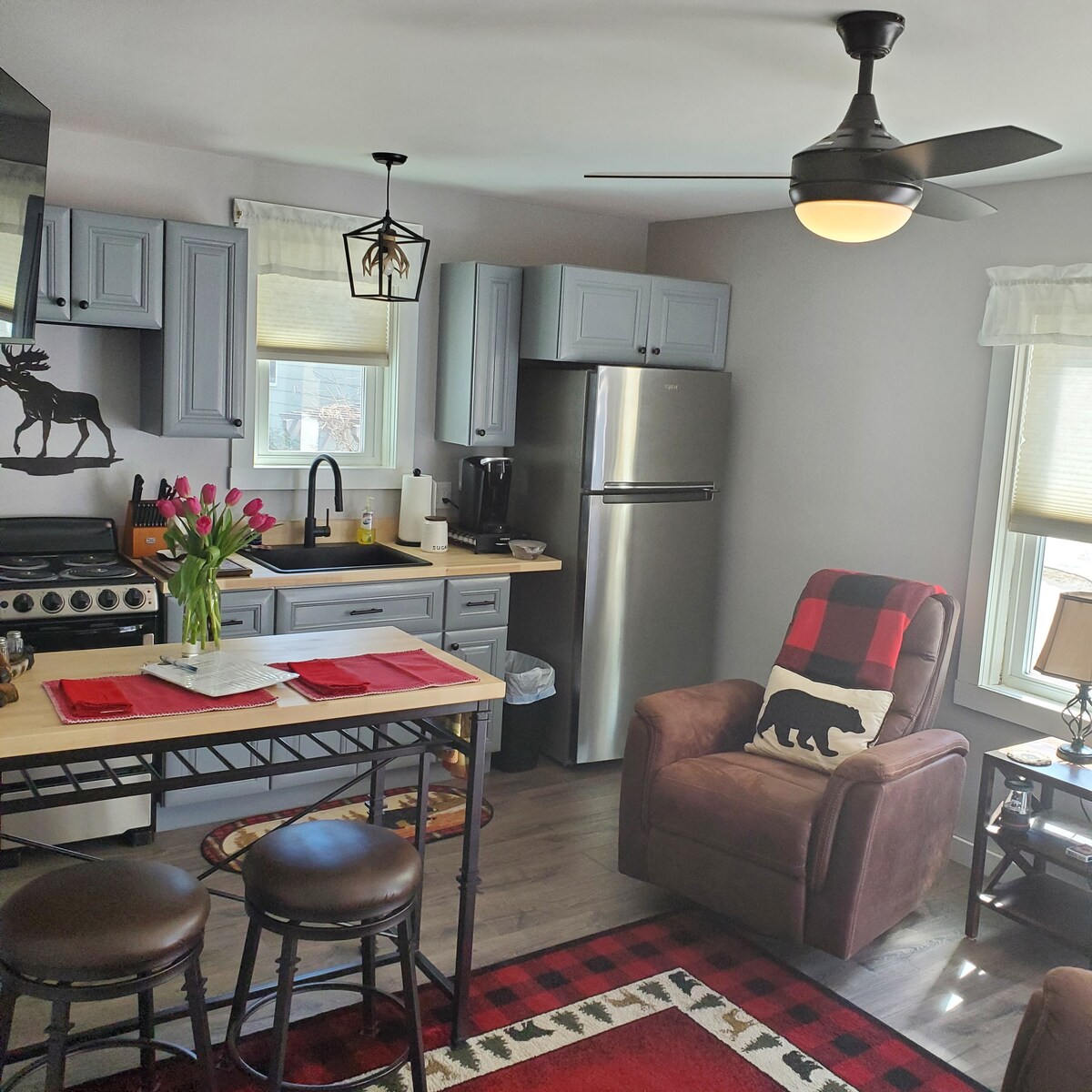 This log cabin tiny home is located right in Campton Village. It is clean, and very bright and cheery thanks to the floor-to-ceiling window that overlooks the Mad River. Includes a SMALL kitchenette (not recommended for those serious about cooking nightly feasts) and a locked outdoor storage space for skis and outdoor equipment. Small 2-person hot tub. WiFi. Level 2 EV charger on site (extra fees apply). 5 min walk from a craft brewhouse, grocery store, a vintage arcade and candy store.