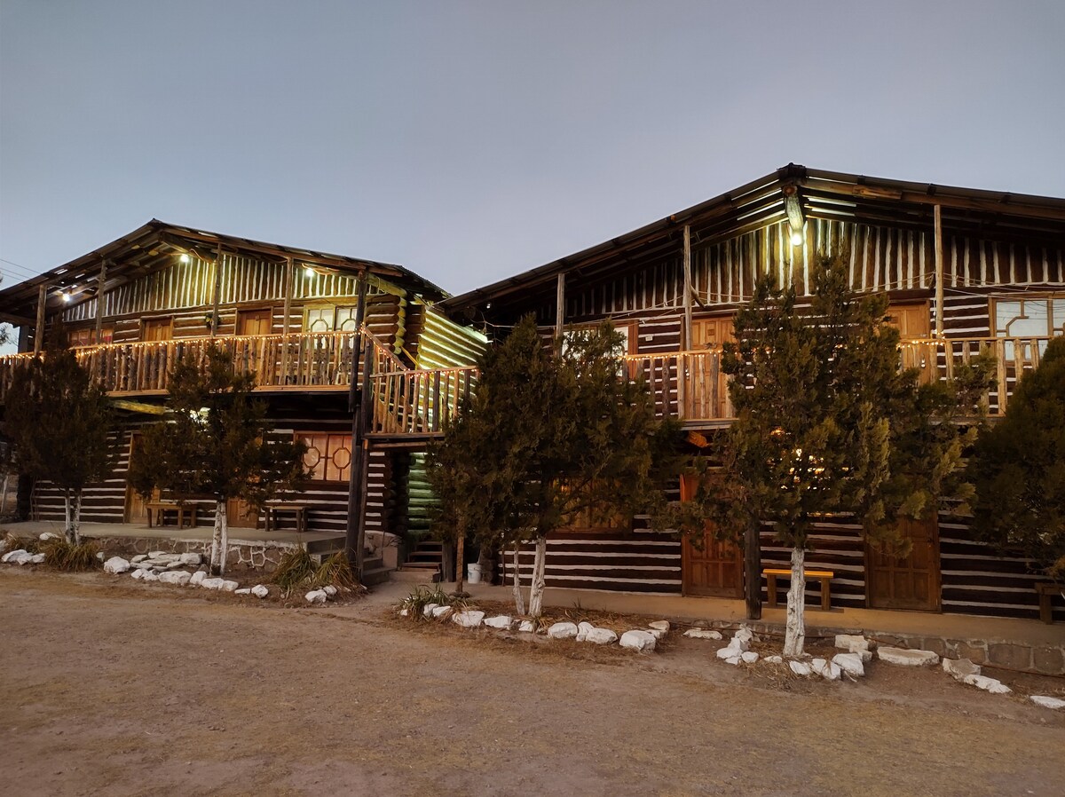 Encantadora habitación para pasar unas lindas vacaciones en compañía de tus familiares o amigos. Cuenta con lo indispensable para hacer de tu visita una experiencia inolvidable. Cuenta tus historias en el área para fogata y disfruta de la comida que tú quieras cocinar en el asador. La habitación cuenta con calefacción por minisplit, a/c, wifi, tv por cable, agua caliente las 24 hrs, secadora de cabello y amenidades. Contamos también con amplio estacionamiento.