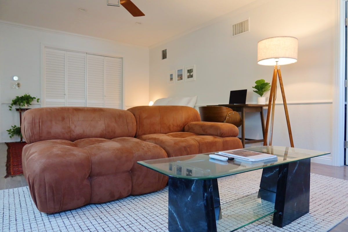 Discover a serene retreat in LA’s historic View Park-Windsor Hills, where mid-century charm meets modern comfort. Relax on the plush suede sectional sofa, unwind in the cozy bedroom with workspace, and refresh in the spa-inspired bathroom with walk-in shower. Enjoy light meals or coffee in the compact kitchenette. Step outside to a neighborhood with beautiful mid-century homes. Quick drives to SoFi Stadium, USC, beaches, and LAX.