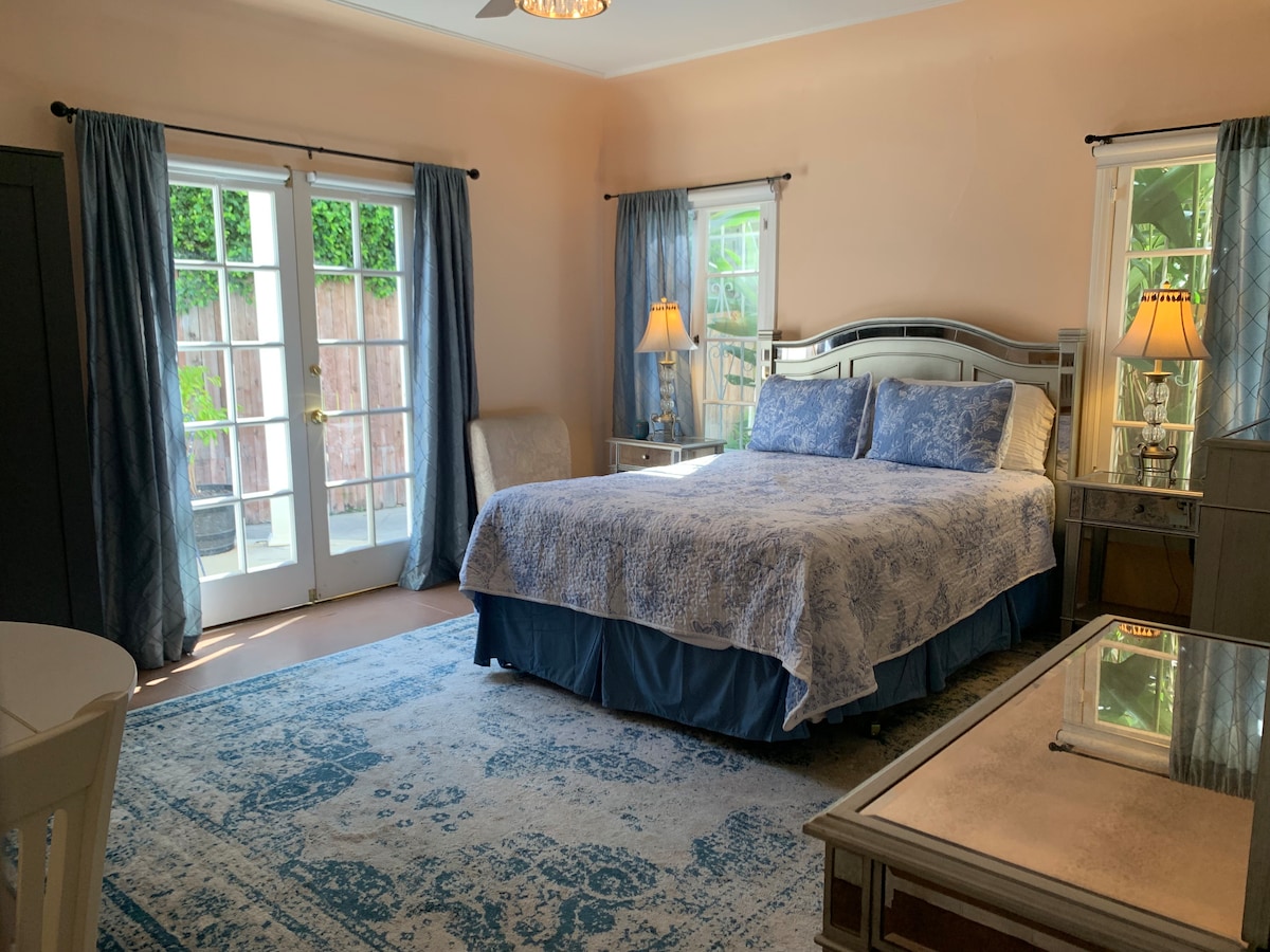 Charming studio in the backyard of a historic Los Angeles home. Surrounded by a lush garden with avocado, citrus, pomegranate trees and a Spanish tile patio, the casita is fully equipped with a king bed, pullout couch, closet, full kitchen, tub/shower and desk. Privacy and serenity in the middle of LA! Historic West Adams is centrally located with easy access to Downtown, Hollywood, Beverly Hills, The Grove, Culver City, LACMA, Koreatown, SoFi and beaches (all within 15-30 min drive).