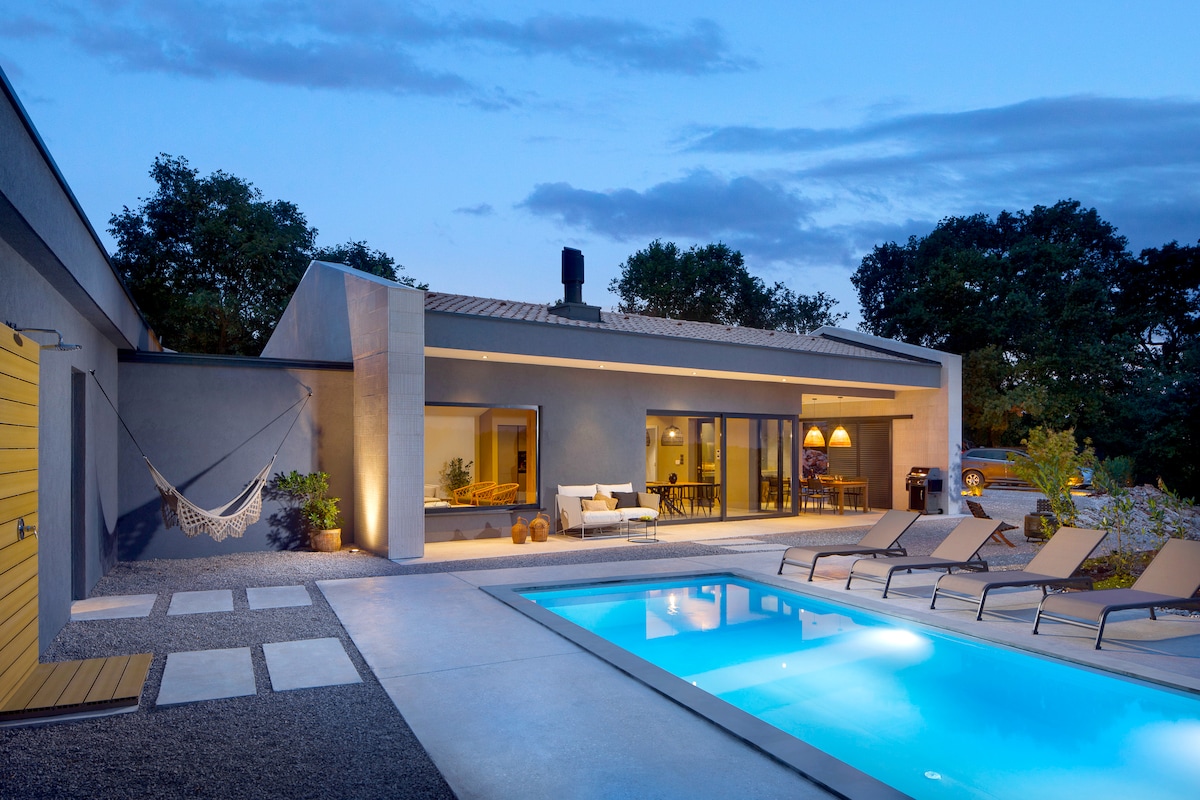 Stylish villa near Rovinj with picture worthy pool, sunk in hot tub, sauna. Wake up to lush, panoramic valley views. Couples and family-friendly, a short drive to adventure park, Brijuni National Park, dinopark, medieval towns & local cuisine. It is a true green escape for anyone looking to get back to nature with all the comfort of modern living. Fully equipped for cooking and entertainment in 2600 m2 of garden (football, speed ball, badminton & pool fun) for your kids and loved ones to enjoy.