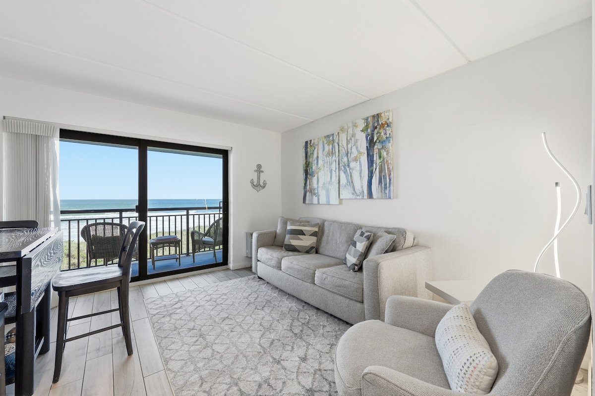 Relax in this clean and cozy one bedroom/one bathroom condo directly overlooking Crescent Beach's beautiful dunes and sandy beaches. This first floor condo features a private oceanfront balcony with a breathtaking view of the ocean only a short walk away from the beach and pool. Condo includes high speed wi-fi, full kitchen stocked with dishes and cookware, comfy king bed, and much more. This condo is ideal for couples looking for a relaxing getaway.