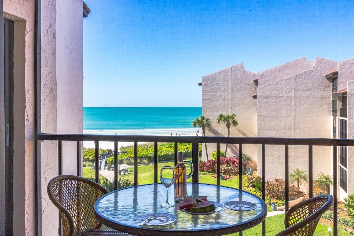 Enjoy ocean views in this 2 bed 2 bath spacious beach side 4th floor condo at Sea Shell Updated coastal decor across from Capt Curts, restaurants, grocery, coffee, ice cream Easy to WALK everywhere No car needed Perfect location Great for families Sleeps 6- 1 king & 2 queens & walk in closets Balcony with GULF views Private beach steps away from bldg. Free beach loungers. POOL Siesta Beach #1 in US Quick Wifi Superhost- 325+ reviews that ave FIVE STAR!