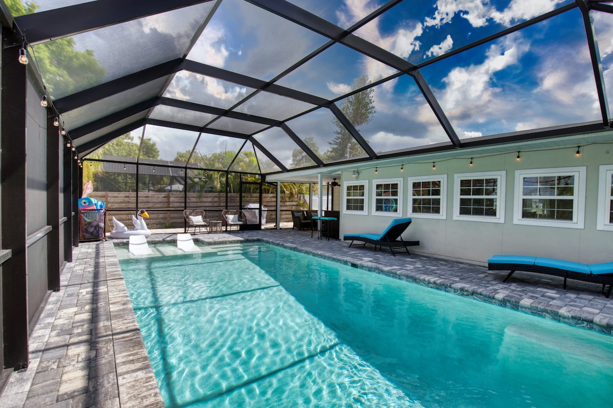 THE PALMS is a single-family home with heated private pool in the heart of Sarasota. The home is 5 miles to the #1 beach in the USA: Siesta Key Beach. It offers 3 bedrooms, 2 bathrooms, a large living space & screened-in sunroom. The fully private, fully enclosed outdoor space is one-of-a-kind with a heated pool, hot tub, BBQ grill, fire pit, beach bar, outdoor TV & lounge chairs for families & snowbirds to enjoy Florida living in style!