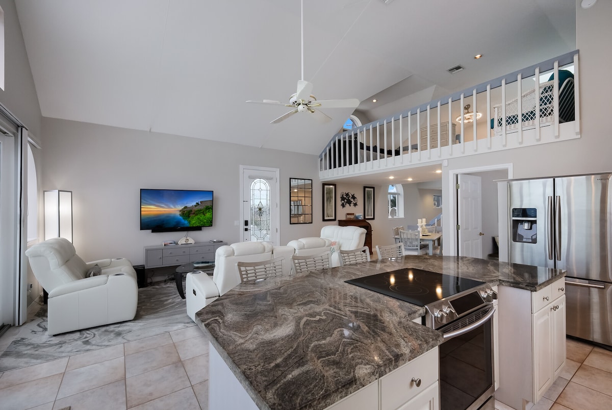 This is a recently renovated honeymoon suite located directly across from the big end of Siesta Key. It is an elegant ground floor pool unit. This unit is equip with marble countertops, tigers eye, lapis lazuli tables, bladeless ceiling fan, alabaster lighting and giant TVs. All of the appliances are stainless/smart and the microwave can cook steaks. There is a gym. The geographic location on the key can not be beat! There is a floating television over the California King luxury memory foam bed.