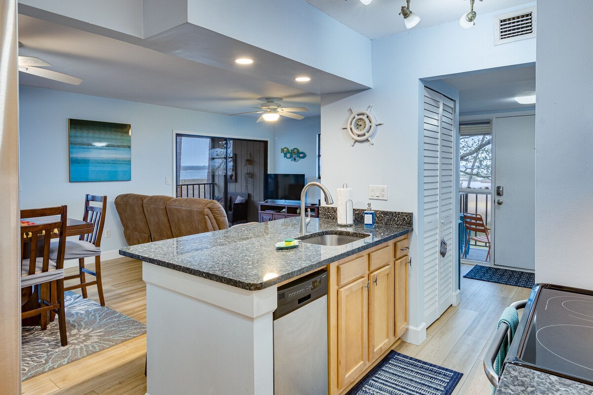 Newly Remodeled 1 bedroom condo with King Size Bed, Queen Size Sleeper Sofa, 55" TV's in Living Room and Bedroom. Stairs to 3rd Floor unit with private patio. Fully Equipped Kitchen, Dishwasher, Washer/Dryer, WiFi, Cable TV, Clubhouse, Fitness Room, Tennis Courts, 2 Swimming Pools (1 heated), Shuffleboard Courts, Picnic Area with Grills & Private Beach Walkway. Dog Friendly (1 DOG ONLY) with a $100 pet fee due on Check In. Must be able to climb stairs 3rd floor condo
