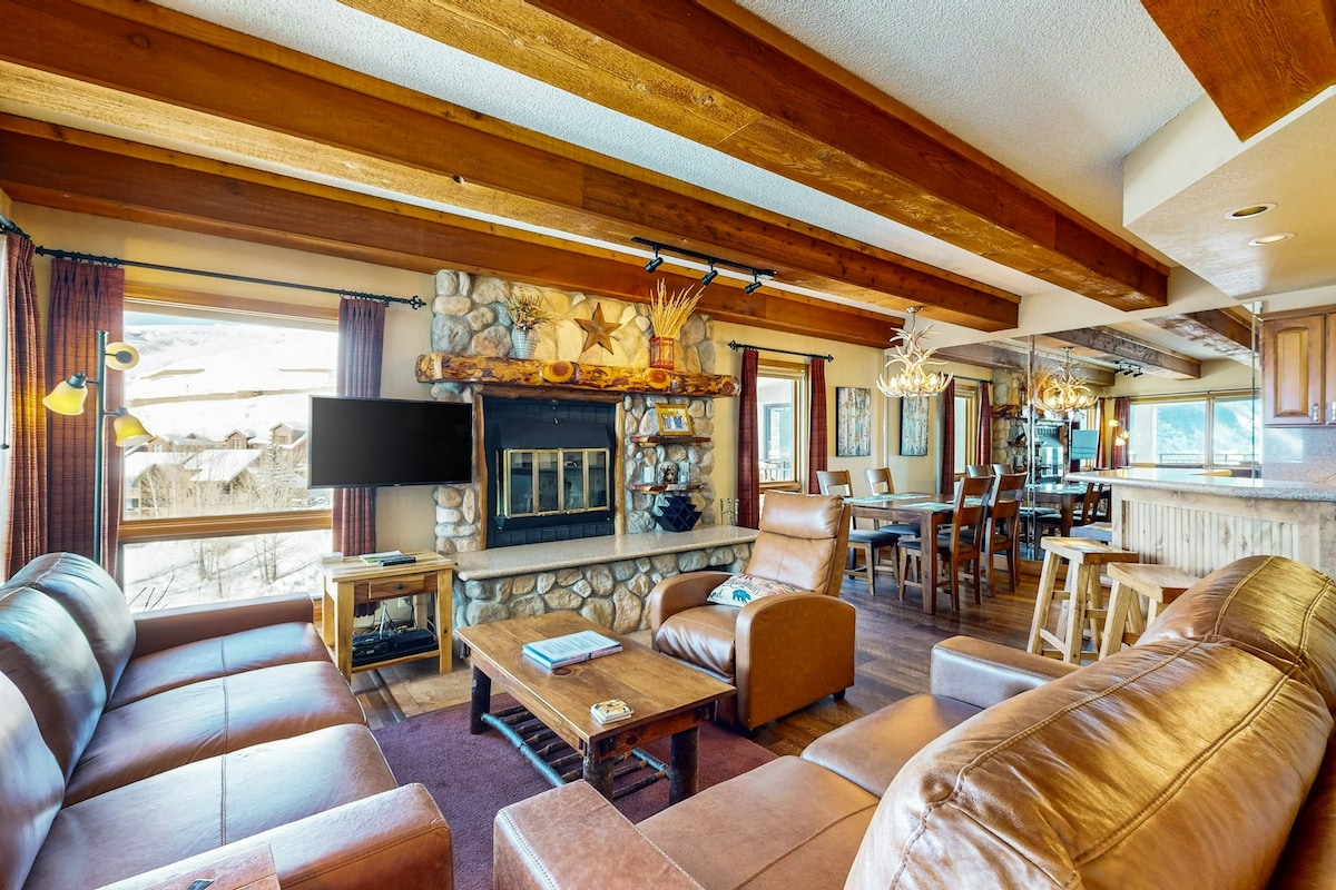 Walk to the lifts (it's a ten minute walk) or take the two minute shuttle ride from this updated 2 bed/2 bath condo. The condo has a pool, hot tub and sauna, wifi, a fireplace, and great views from the deck. Free bus to the lifts and town stops right in front of the building! Easy access to biking/skiing/trails. PLEASE NOTE: Pool/hot tub/sauna will be closed from April 4- Memorial Day & Labor Day-Thanksgiving. Please check with us BEFORE booking if you have concerns.