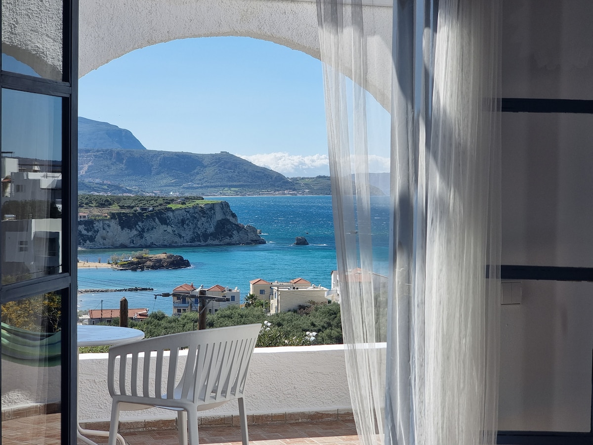 Marvelous sea VIEW from your arched balcony. Private newly renovated big suite, double bed, kitchen with utensils, bathroom, balcony with hammock. SUPERB, PRIVATE, AND COSY. You will feel at home. Breakfast in request:) Peaceful, quiet retreat away from the bustle, 7 min walk to amazing Almyrida sandy beach, shops, restaurants, and the best taverna with homemade food a few steps away. Close to Samaria gorge, Balos, Elafonisi beaches, Chania and Rethymno. 7olivescrete