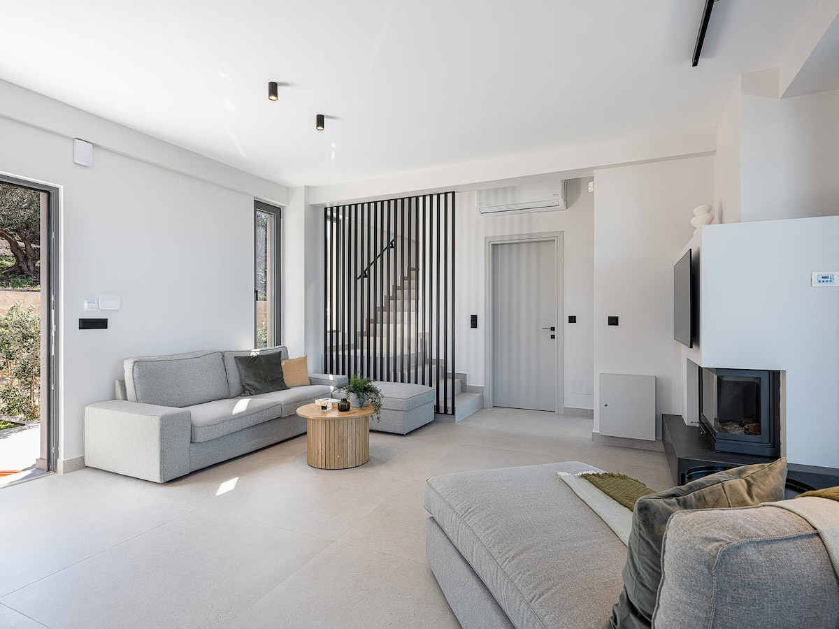 The villa enjoys a unique rural location. Set on a spacious private plot, fully enclosed by a stone wall and metal fencing. The beautiful rural setting provides the perfect atmosphere! A small pebble beach can be reached after a short walk through a wild stony pathway. Only in 5-8' driving you are in all the amenities! In 2026 there will be two more villas in the area but without obstructing the marvelous rural views. Around April new photos of the area will be available to be uploaded.