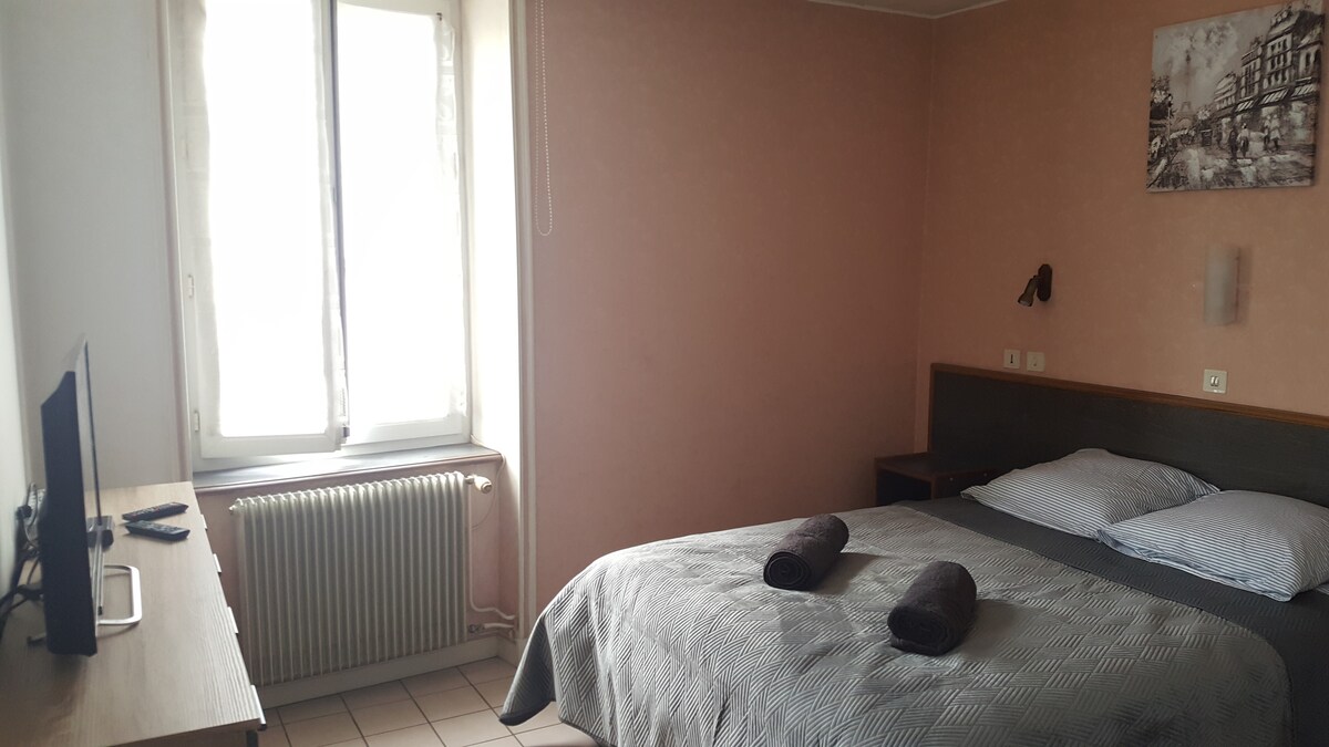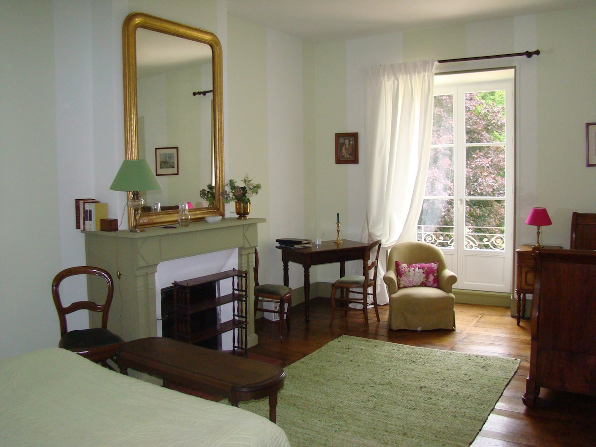 Jolie chambre familiale dans le château Saint Roch d'Ambazac. Peut loger un couple, un enfant, et un bébé. Lit bébé homologué NF et équipements bébé. Vue sur le parc (2 Ha) aux arbres centenaires, bassin et rivière anglaise