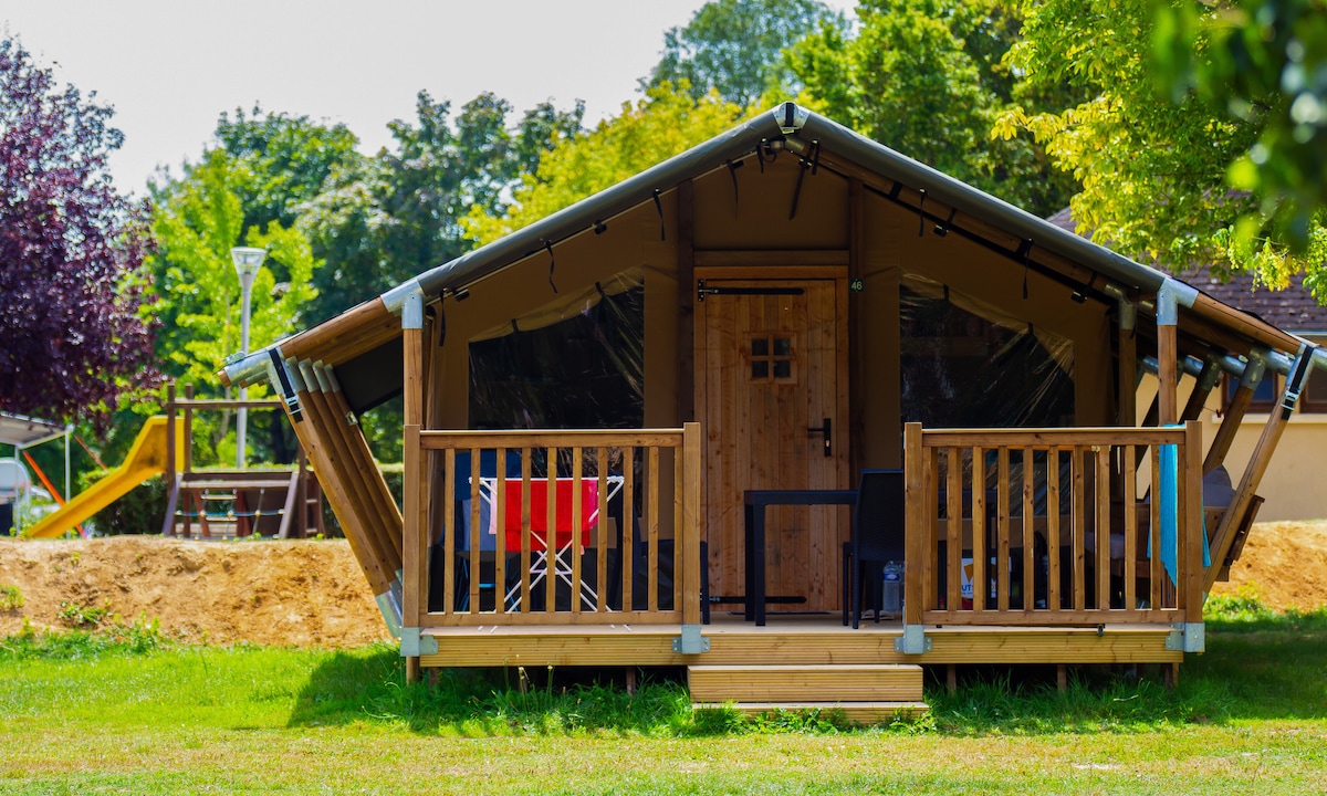 lodge indépendant dans la propriété. Equipé d'un coin repas, d'un couchage 180x200 (2x90x200) et d'une chambre avec lits superposés Notre bouledogue français Natty fait partie intégrante de la famille et saura vous accueillir en vous faisant la fête Draps + linges de toilette fournis Petit déjeuner en supplément et sur demande. Le lodge n est pas équipé de chauffage (ouvert uniquement à la belle saison)